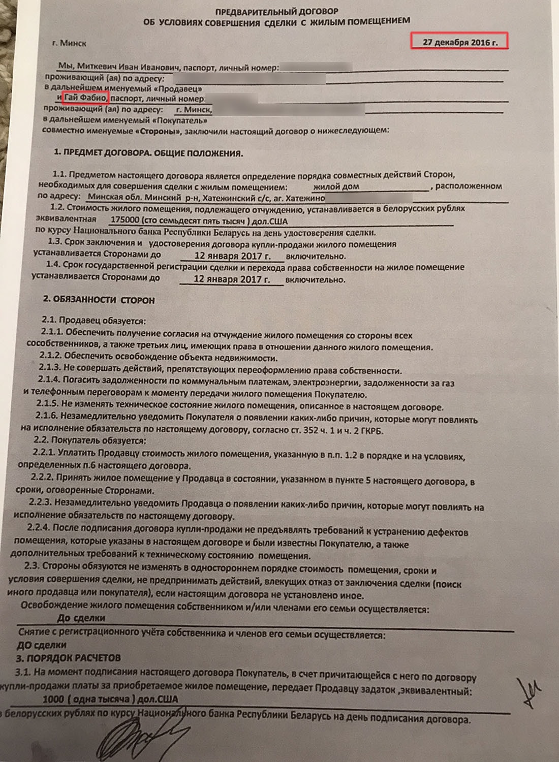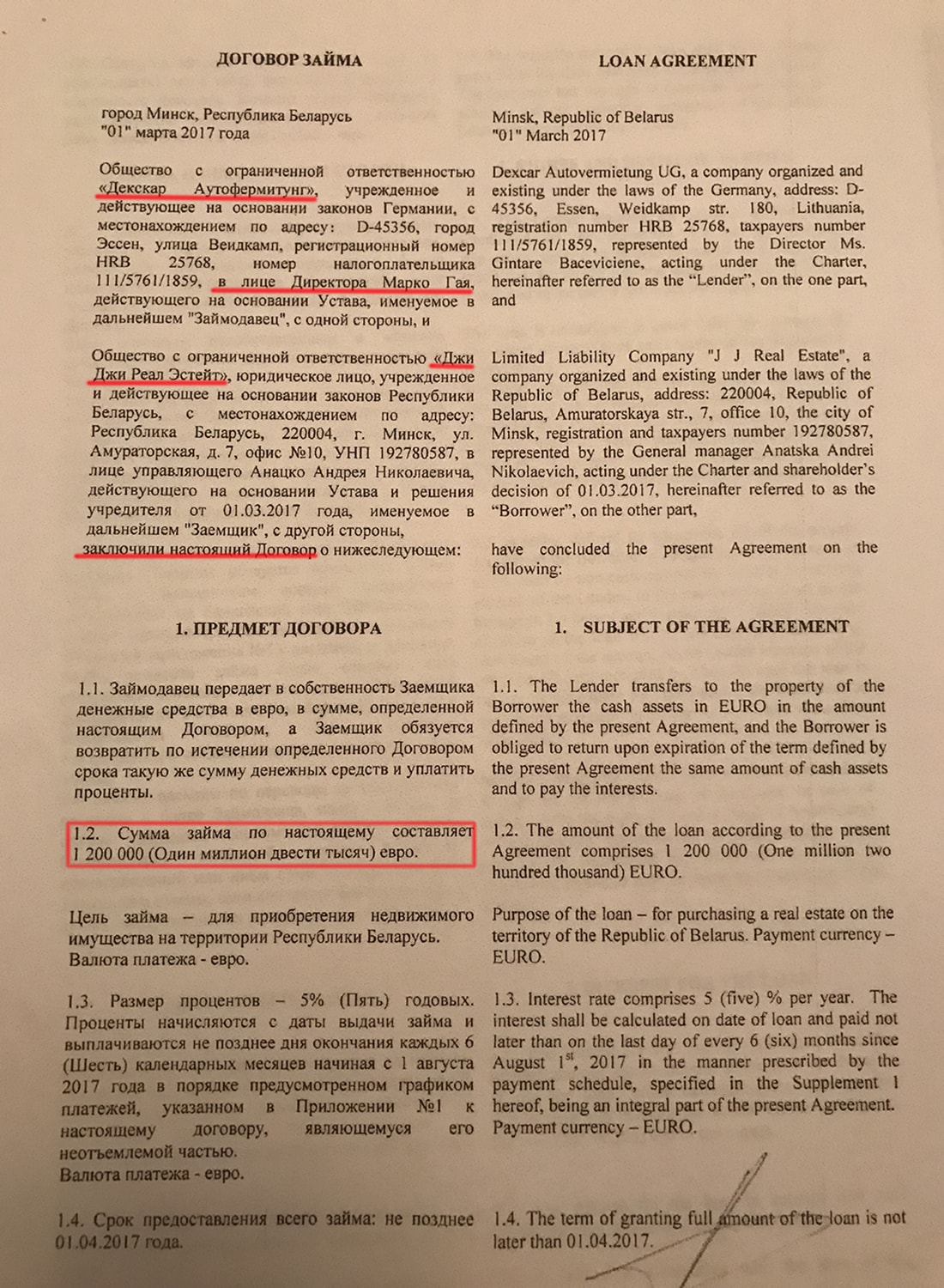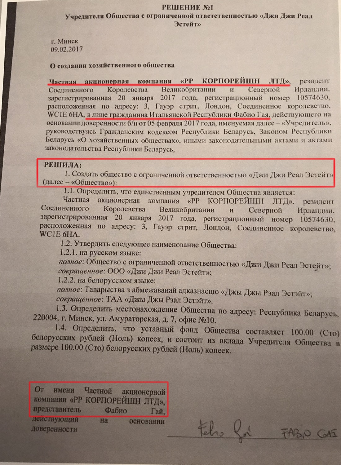 В нашем распоряжении оказался целый перечень документов, благодаря которым удалось восстановить финансовую цепочку. В предварительном договоре говорится, что дом в Хатежино площадью чуть более 261 кв. м. за 175 тысяч долларов США хотел купить Фабио Гай (в декабре 2016 года). В марте 2017-го был заключен другой договор — о продаже земельного участка с жилым домом той же площади, только покупателем выступило ООО «Джи Джи Реал Эстейт», зарегистрированное в Едином госреестре Беларуси. В марте 2017 года это ООО получило заем от «Декскар Аутофермитунг», представленного в лице Марко Гая (брата Фабио), на 1,2 миллиона евро. Компания «Джи Джи Реал Эстейт» была создана учредителем — «РР Корпорейшн ЛТД» (резидент Великобритании), который был представлен в лице опять-таки гражданина Италии Фабио Гая, действовавшего на основании доверенности. Известно, что помимо жилой недвижимости упомянутое ООО выкупило и пару административных помещений.
