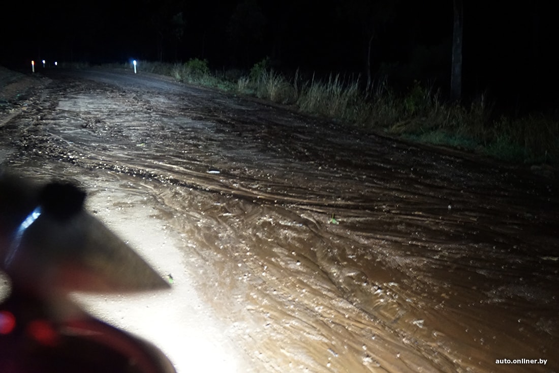 В связи с тропическими ливнями на большинстве дорог установлены измерители уровня воды. Трассы размывает сильно, красная пыль превращается в скользкую глину, а песок засасывает колеса — удовольствие не из приятных. Поэтому австралийцы редко совершают дальние поездки в сезон дождей.