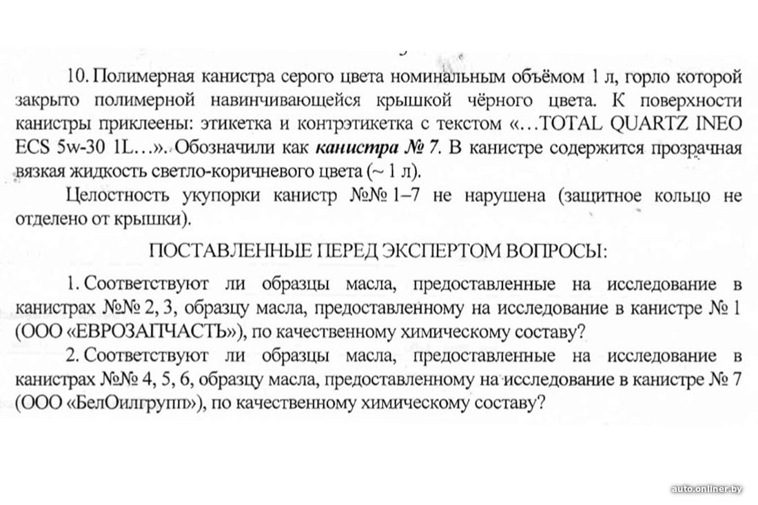 Выводы экспертов были такими: состав двух образцов (контрольных, предоставленных официальными поставщиками) характерен для синтетического масла, состав пяти остальных — для минерального.