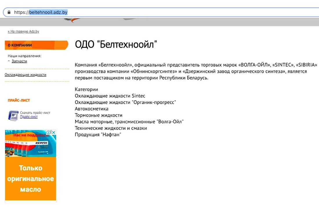 Данные на четвертой банке Elf вывели нас на организацию с названием «Белтехноойл», на сайте которой указано, что она является «официальным представителем торговых марок „Волга-Ойл“, „Sintec“, „Sibiria“».