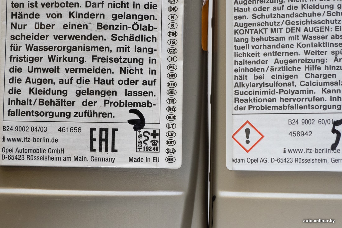 А адрес производителя лишь у эталона указан как «Opel Automobile GmbH», у остальных — «Adam Opel AG», у №9 — «Adam Opel GmbH».