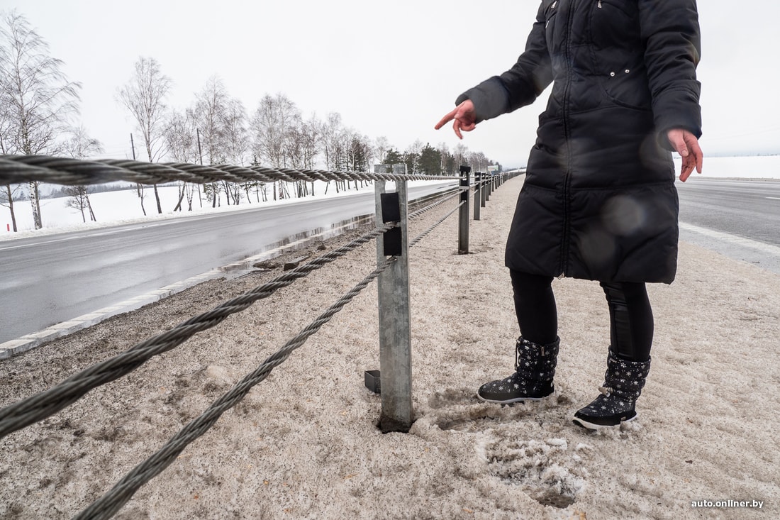 Во время нашей встречи Людмила собственноручно продемонстрировала, как легко снять трос со столбиков. «Сейчас их уже серьезно подтянули, — женщина без особых усилий снимает верхний трос с крепления. — Раньше было хуже». Конечно, после такой визуализации мы задумались над вопросом, а способны ли тросовые ограждения удержать машину от выезда на встречную полосу в принципе? Ведь именно в этом их первостепенная задача — обеспечить безопасность.