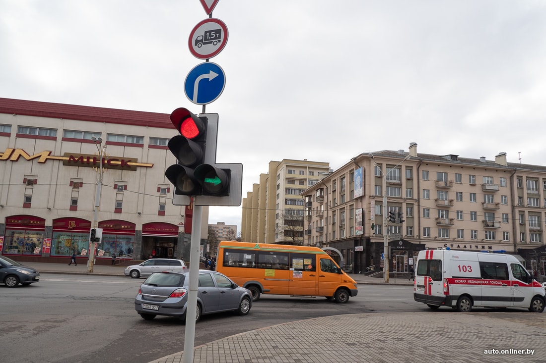 Первый перекресток — пр. Независимости и ул. Свердлова. Разворачивающимся возле главпочтамта постоянно не уступают.