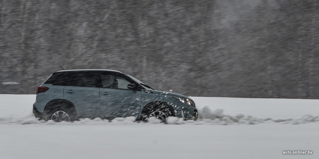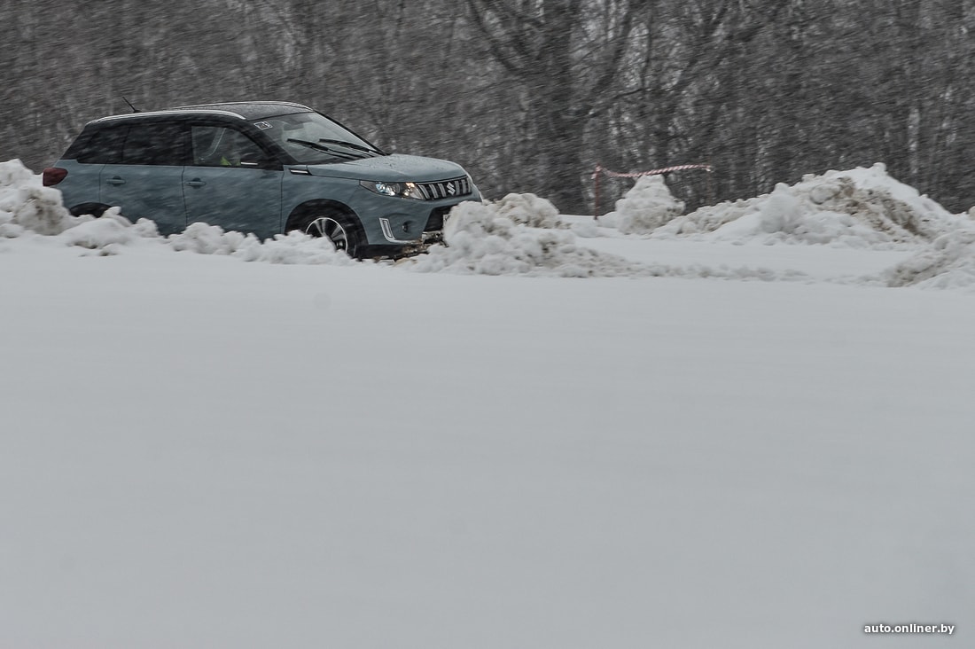 А дальше было самое интересное. Нам предложили быстро (и на время) проехать по извилистой спринт-трассе, проложенной по снежной целине. Весна, другие гонщики, трактор сделали на поле глубокую колею и месиво из снега и грязи. В реальной жизни еще подумал бы, надо ли туда ехать в принципе? Конечно, в бездорожье лучше отправляться на полноприводной версии. А еще лучше — на тракторе. Отчаянные русские блогеры и журналисты точно не думали, просто ехали. Нам было страшно и больно — за пассажиров, за себя, за новый Vitara.