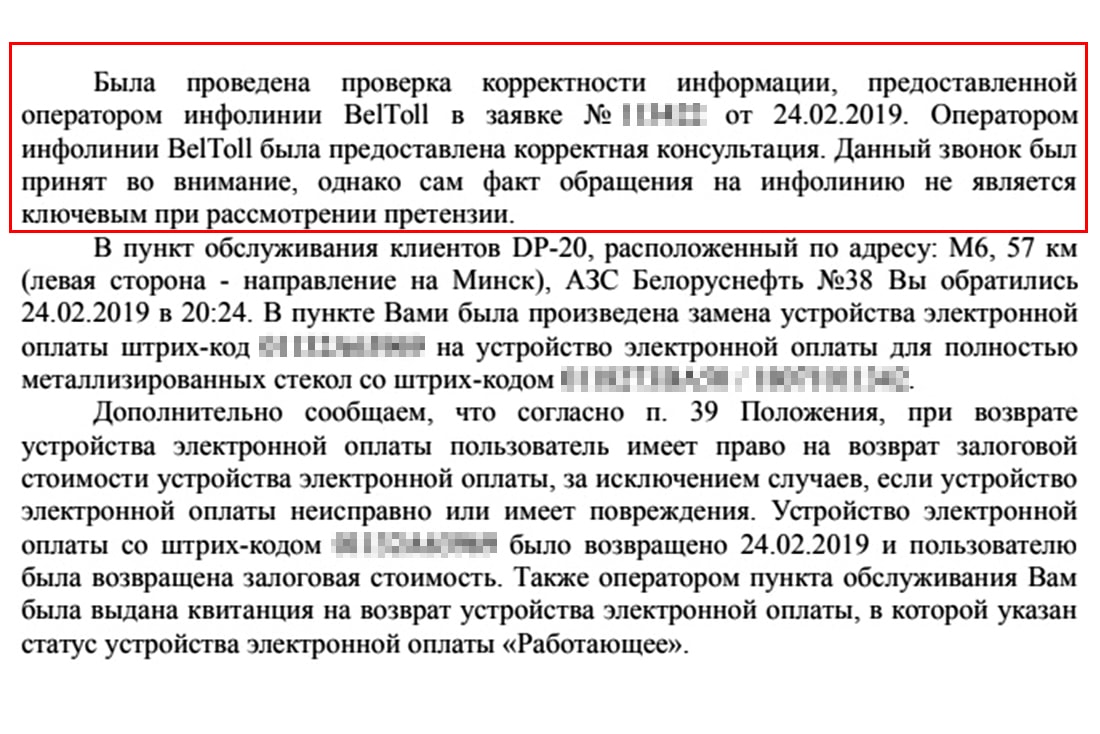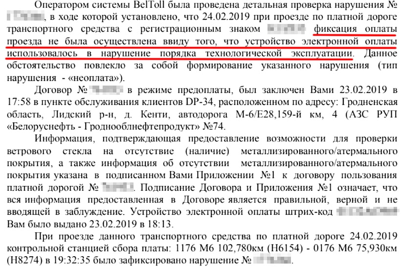 Мирослав все же подал свою жалобу повторно. На этот раз ее рассматривали куда дольше — все 15 рабочих дней, предусмотренных законодательством. И полученный по истечении этого срока ответ нашего собеседника не удовлетворил. В ИООО «Капш Телематик Сервисиз», являющемся оператором системы BelToll, сообщили, что водителю была предоставлена возможность проверить с помощью специального оборудования, является ли ветровое стекло его автомобиля полностью или частично металлизированным. От этого зависит, какое устройство BelToll необходимо использовать. В итоге же порядок технологической эксплуатации прибора был нарушен, а раз водитель подписал договор на пользование платной дорогой, то он подтвердил, что вся информация в документе является корректной. Короче, сам виноват — такой вывод.