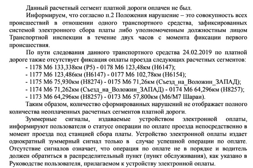 Транспортный инспектор уведомил водителя, что тот не оплатил пользование трассой на определенном отрезке. Соответственно, положен штраф (плата в увеличенном размере) — 100 евро. И это штраф за одну рамку. Как узнал автомобилист, фиксация происходит раз в два часа: после того как он проехал без оплаты под первой рамкой, у него было время доехать до Воложина, чтобы решить возникшую проблему. За проезд под остальными рамками в течение этих двух часов не штрафуют.