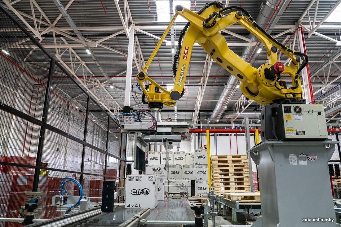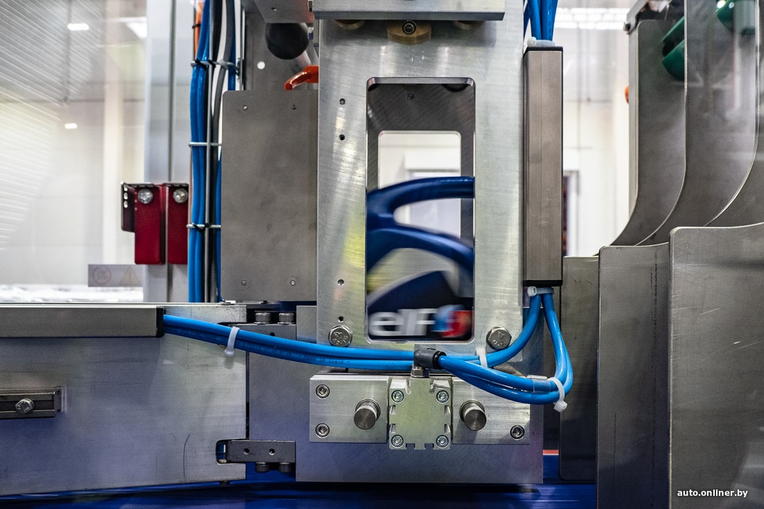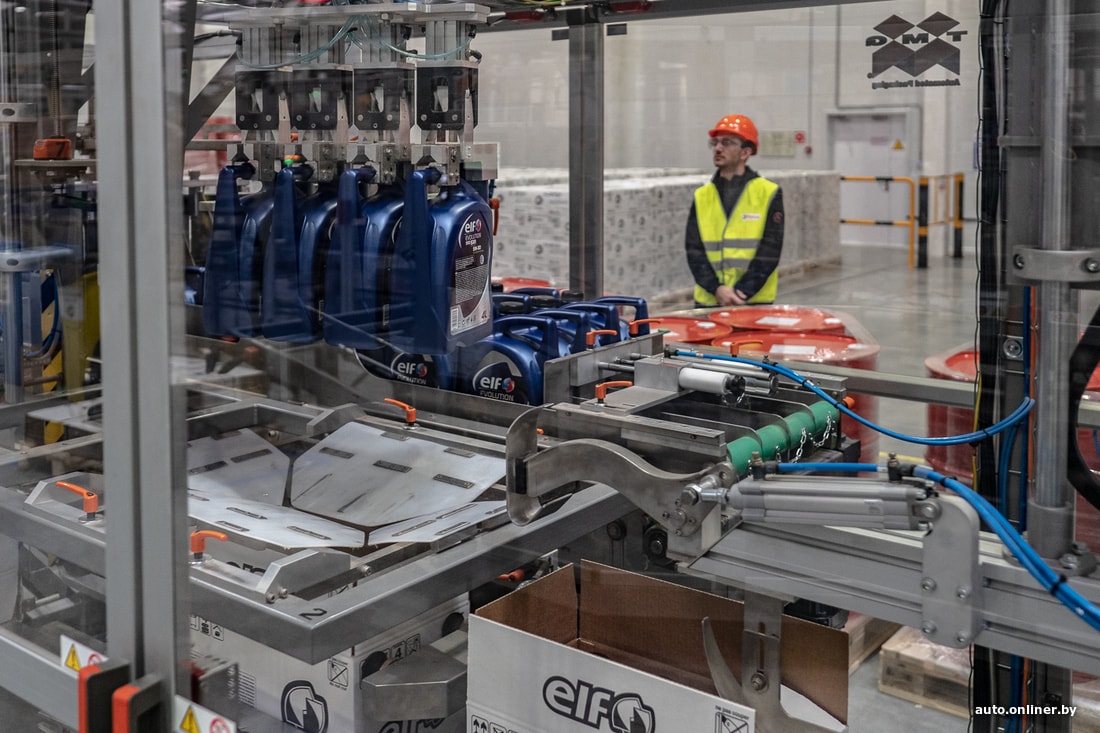 Нас же больше интересует линия по выпуску самого ходового объема — в 4 литра. На данном заводе производят масло Total и Elf. Мы попали на процесс разлива масла второго бренда.