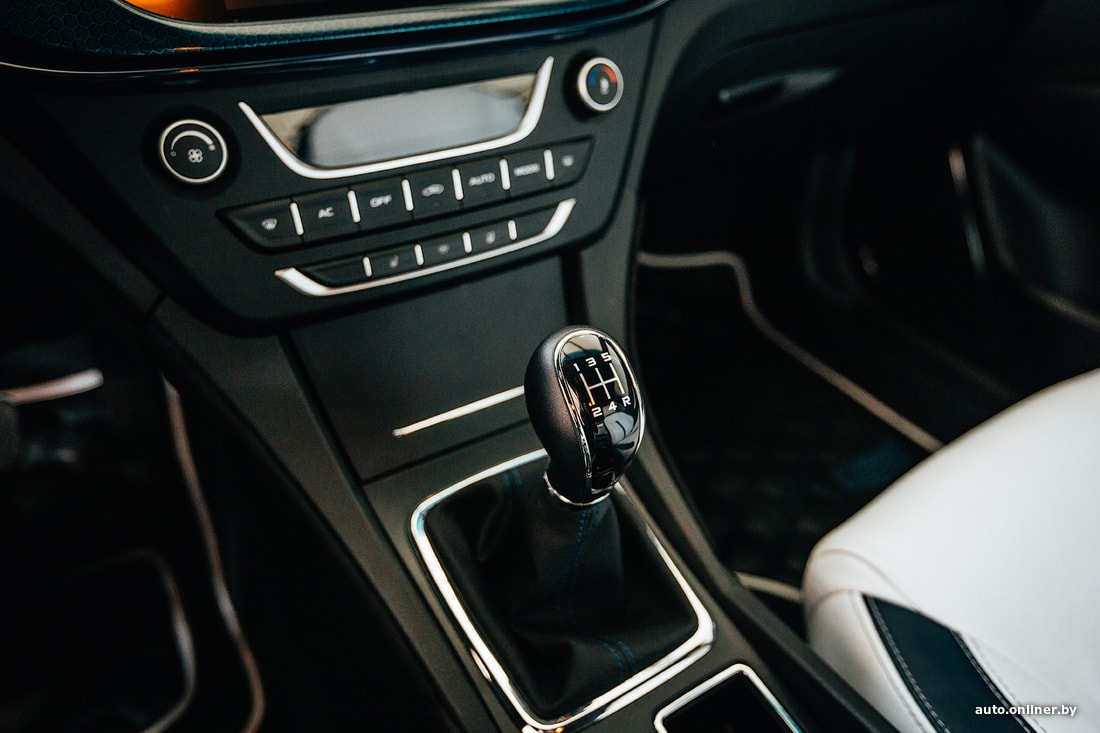 А вот на руле, рычагах КПП и стояночного тормоза строчкой выделили синий оттенок.