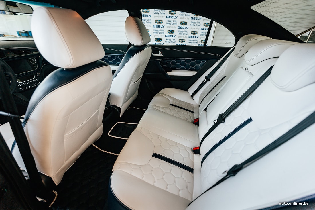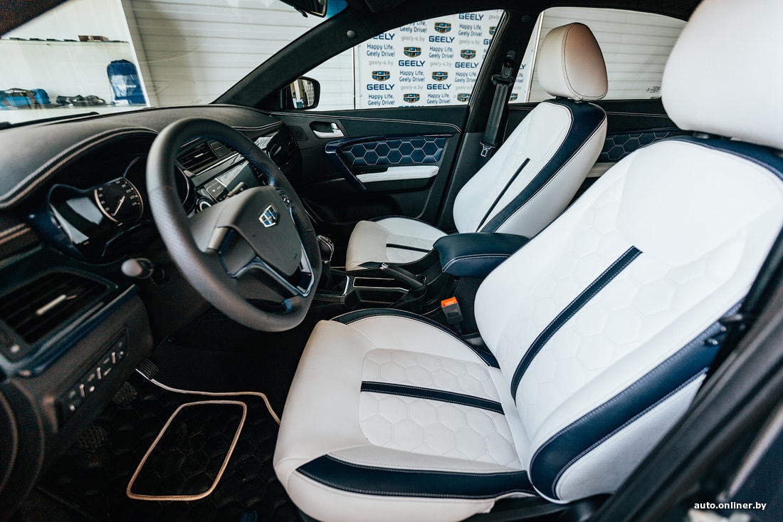 Это сложно было представить, но салон Geely может быть выполнен в белой коже. За основу рисунка взяли форму шестигранника. Посчитали, такая строчка подчеркнет современность.