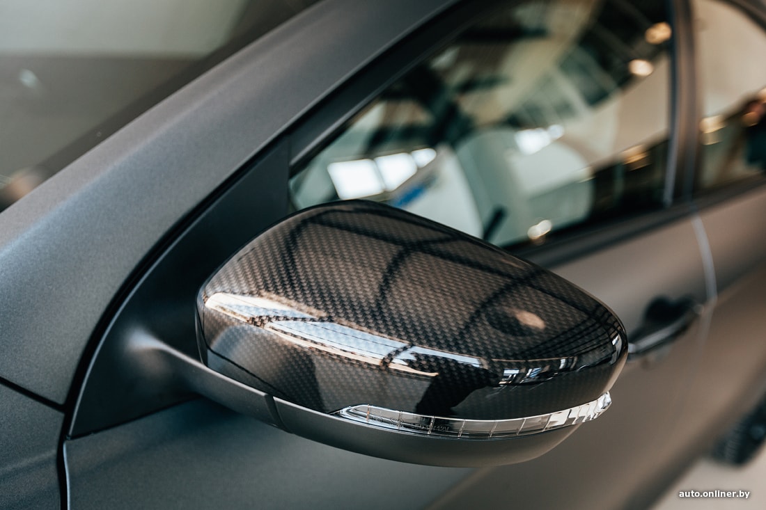Продолжает тему затемнения экстерьера пленка под карбон. Ею решили покрыть хромированные элементы, выбивавшиеся своим блеском из концепции проекта. Карбоновыми стали накладки у передних ходовых огней, окантовка логотипа, нижний дефлектор, корпус боковых зеркал.
