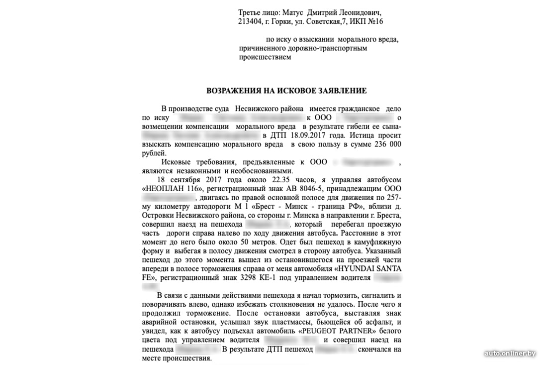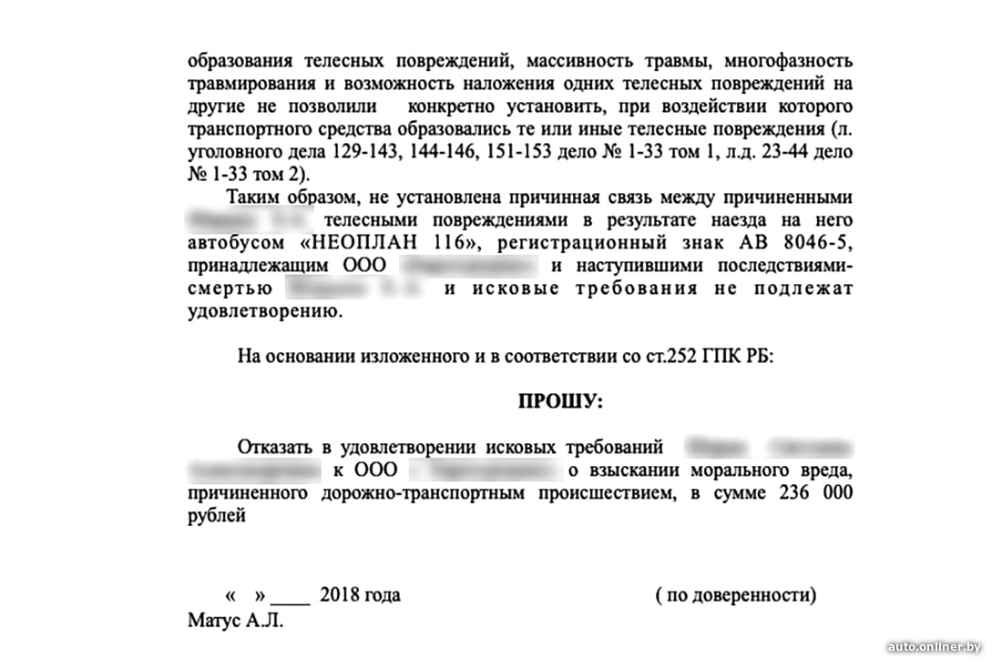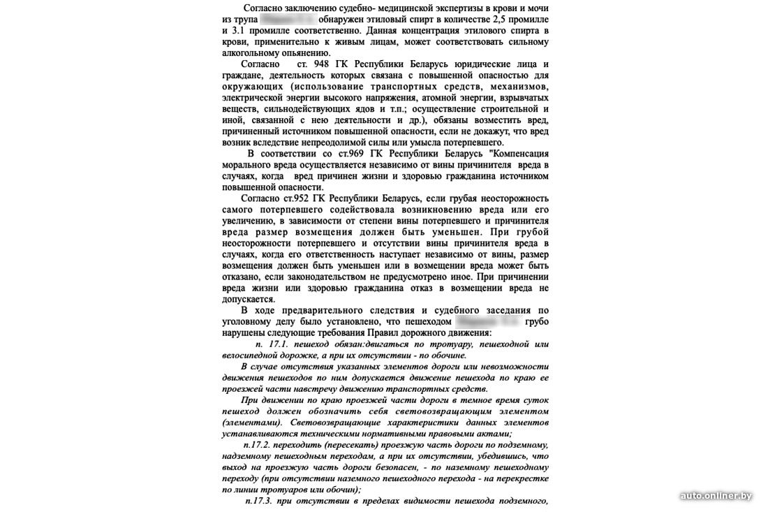 Истица оценила ущерб в 236 тысяч рублей. Также она просила взыскать 150 тысяч рублей с владельцев Peugeot. Подчеркнем, что во время судебного заседания в Несвижском районном суде (в июле 2018 г.) судмедэксперты не смогли дать четкий ответ, каким именно транспортным средством были нанесены критические травмы пешеходу, вышедшему на проезжую часть первым.