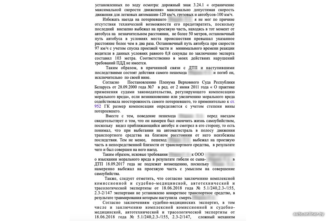«Поведение пешехода перед наездом свидетельствует о том, что он был намерен покончить жизнь самоубийством, поскольку видел приближающийся автобус и смотрел в его сторону, то есть понимал, что при выбегании на автомагистраль в полосу движения транспортного средства на близком расстоянии от него неизбежны последствия»