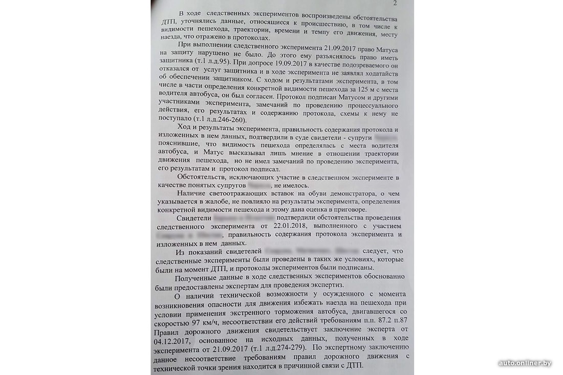 Как указывал в кассационной жалобе Дмитрий Матус, свидетели ДТП давали противоречивые показания, а следственные эксперименты были проведены с нарушениями. В результате, по мнению обвиняемого, были неверно определены место наезда и удаленность автобуса Neoplan в момент появления пешехода, что повлияло на выводы экспертов.