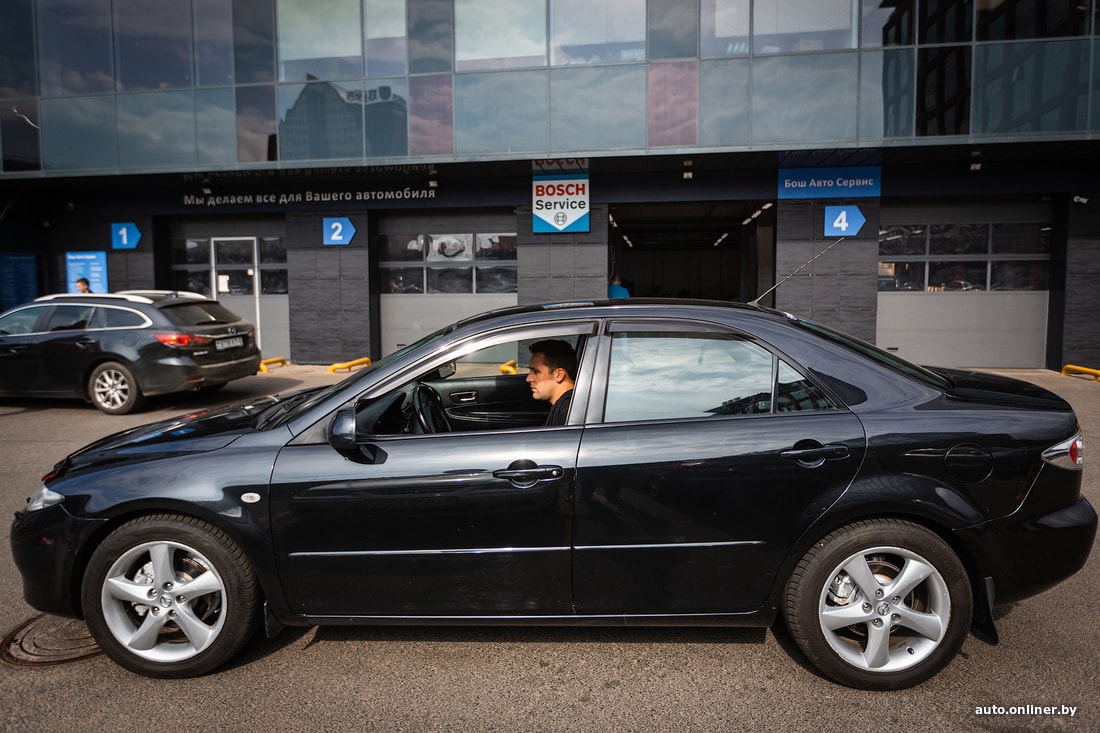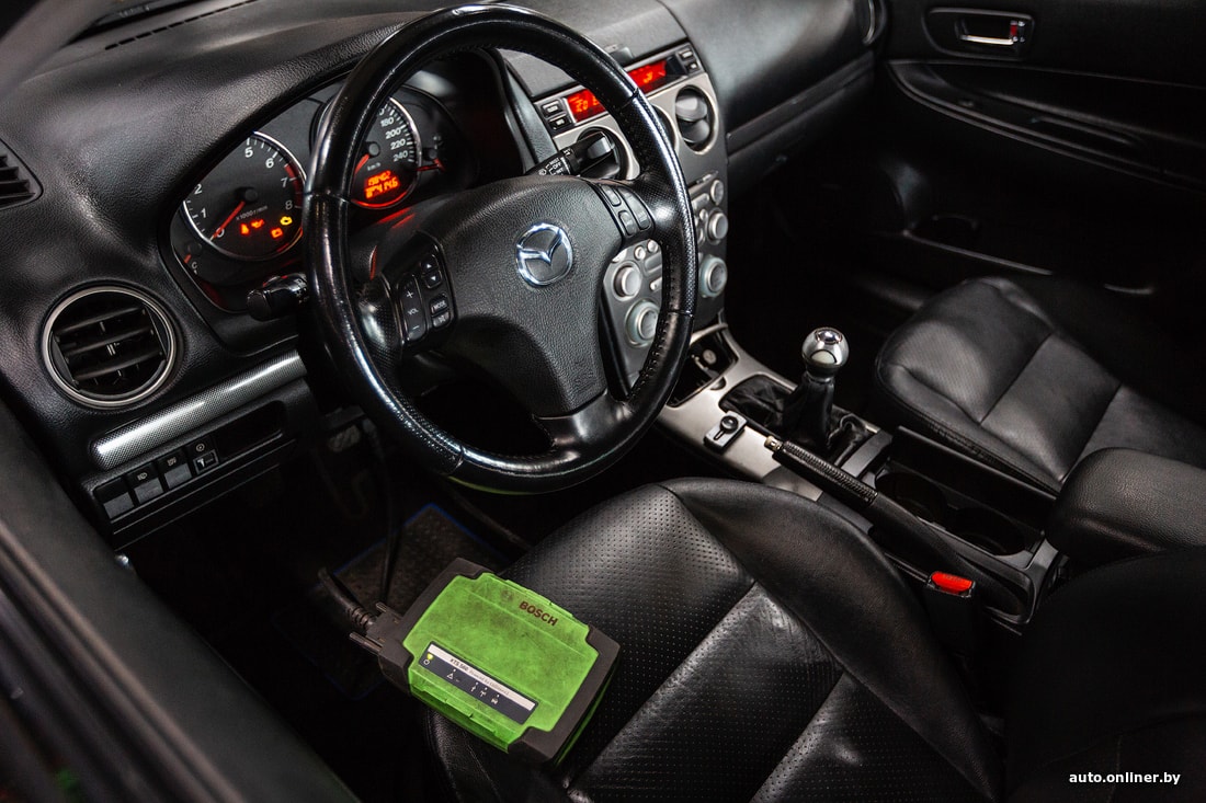 Пока специалисты Bosch осматривают автомобиль на подъемнике, у нас есть время поговорить с продавцом. Александр отмечает, что машина досталась ему по наследству: «Поездил на ней с месяц, весьма понравилась. Теперь хочу купить себе Mazda6, но новую и с АКПП. Найти „японца“ этих годов в живом состоянии довольно сложно, но этот вариант, я считаю, вполне неплохо сохранился. Насчет кузова скажу, что есть пара „жучков“, однако они не критичны. Еще один нюанс — царапина на водительской двери. Ощущение, что кто-то оставил ее ключом специально. Если быть честным, то покупателю стоит знать и о дырочке на водительском сиденье — скорее всего, от сигареты. В остальном я в машине уверен — подвеска не стучит, разгоняется и едет отлично».