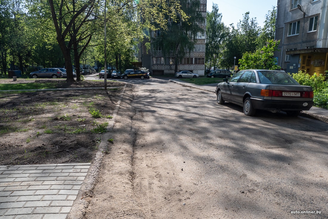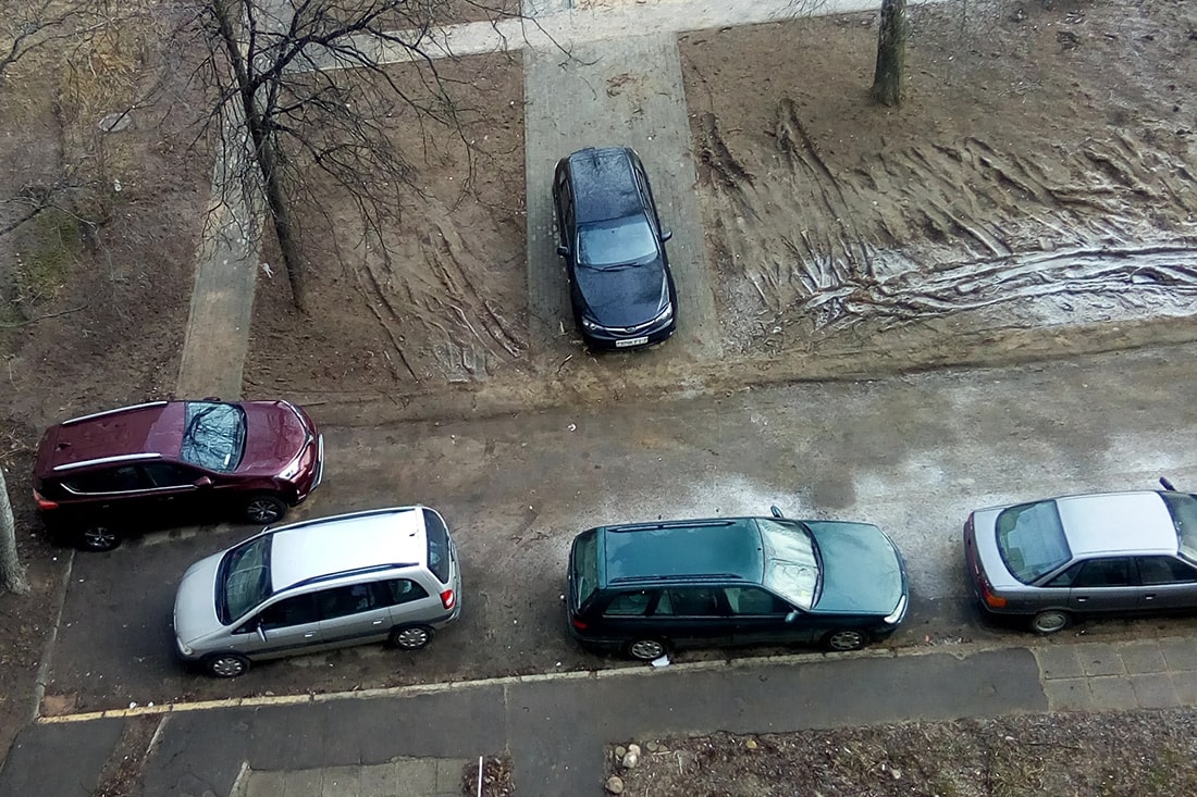 — Я не сторонница наказаний, изначально решила обходиться без ГАИ, своими силами. Своими силами во дворе я посадила деревья, высадила траву, лопатой отскребла нанесенную колесами землю с асфальта и наконец откопала этот самый бордюр. Решила, и тут справлюсь единолично. Никто из соседей меня не поддержал. Каждый раз, когда я видела машину на зеленой зоне, оставляла записку со следующим текстом: «Вы стоите на газоне. В случае повтора нарушения приедет ГАИ». Скандаливший мужчина однажды проехал по земле, а потом остановился на тротуаре. Обстановка была схожей с той, что на фотографии ниже.