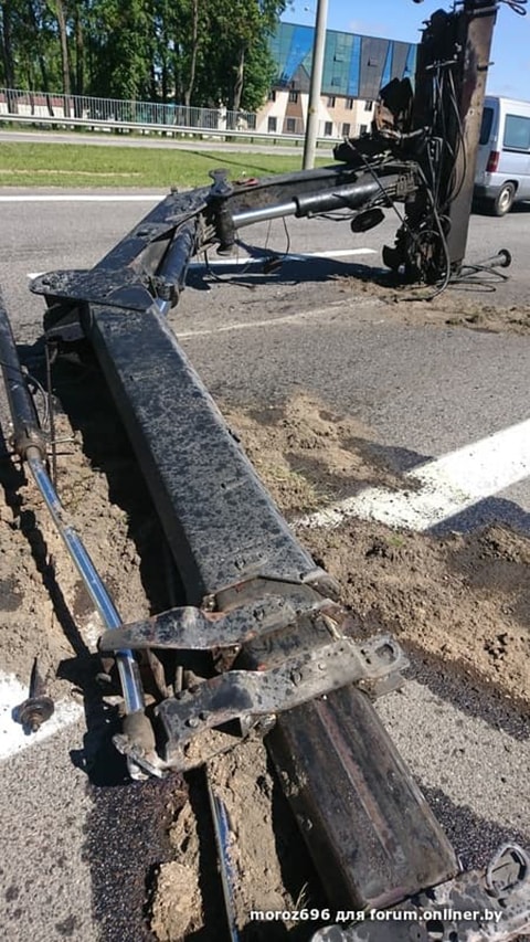 — Машина ехала по трассе М2 со стороны Минска в направлении Кургана Славы. Водитель, похоже, забыл сложить кран-манипулятор и повредил пешеходный мост. Манипулятор при этом оторвался от машины и остался валяться на дороге, — рассказал он.