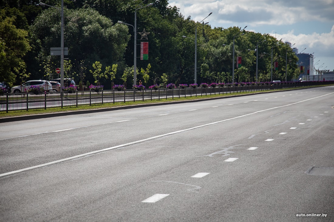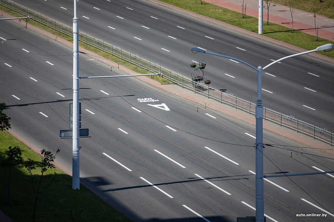 Разметка на проспекте уже нанесена. В результате крайняя правая полоса выделена для движения общественного транспорта, а крайняя левая — для транспорта II Европейских игр. Соревнования пока не начались, и водители привычно занимают выделенную полосу. Смогут ли они в один день перестроиться на новую организацию дорожного движения?
