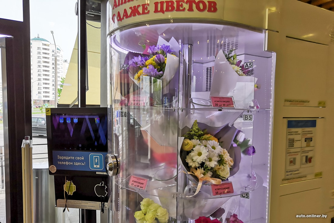 Из специфического оборудования можно заметить бокс для зарядки гаджетов и эксклюзив — аппарат по продаже цветов. В углу зала под вывеской «Банкомат» его самого не найти — там разместилась точка страховой компании.