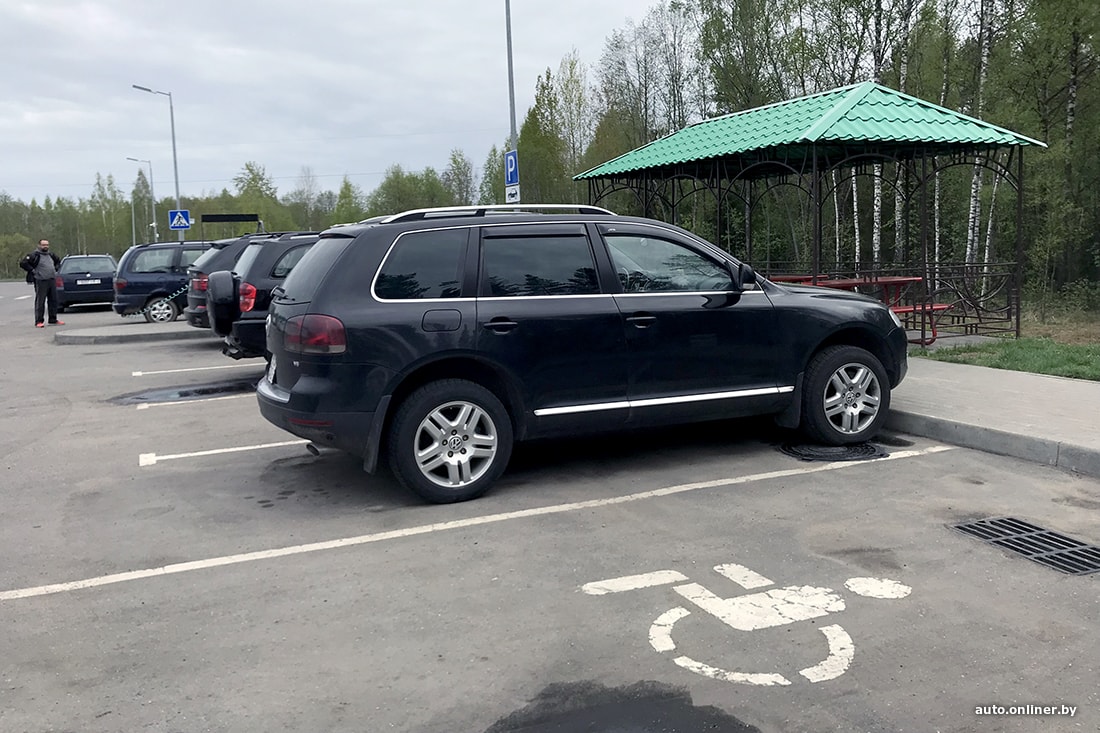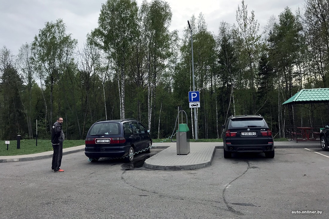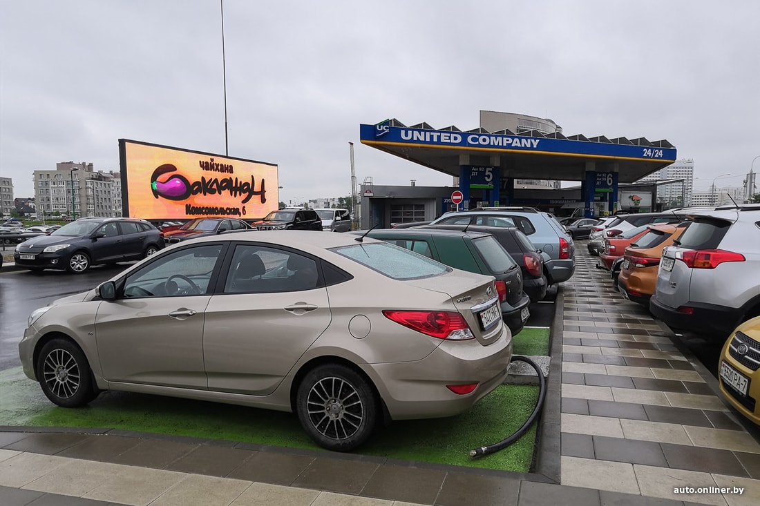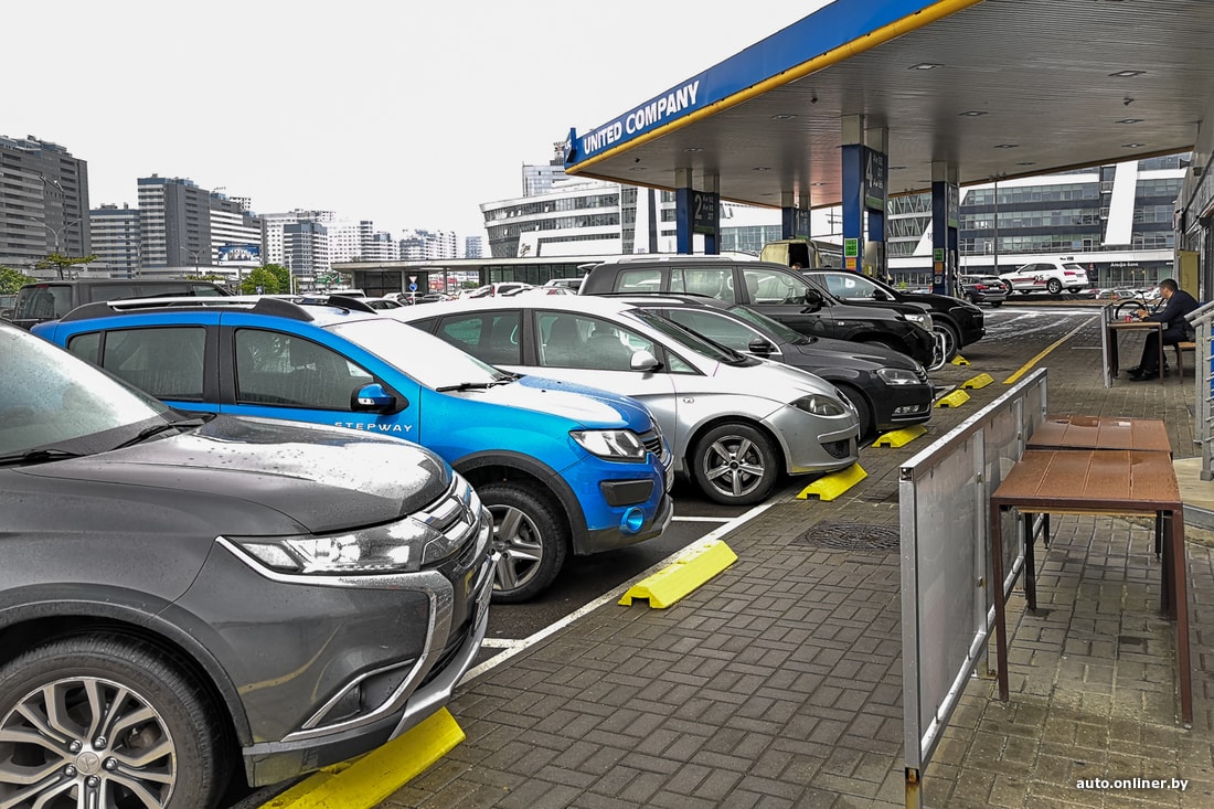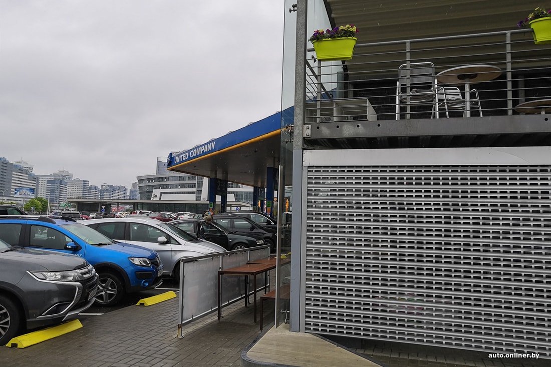Заехать на станцию можно только со стороны выезда из города. На перекрестке у «Минск-Арены» запрещен поворот налево и разворот (с 7:00 до 22:00). Потому тем, кто движется по направлению к центру, приходится ехать до ТЦ «Арена City» — только там можно развернуться. В день нашего визита вся прилегающая парковка внушительных размеров была занята. Нашлись и те, кто оставил машину вторым рядом. То ли такое популярное место, то ли дело в автовладельцах из соседних офисных зданий. Стоянки для грузовиков не заметили. Зато других бонусов предостаточно: пылесос, аппарат по подкачке шин, прокат самокатов, несколько велопарковок. Асфальт в двух местах на парковке окрашен в зеленый цвет — очевидно, для электромобилей. Правда, из земли торчит только кабель, без штекера. Полноценной электрозарядки не видно.