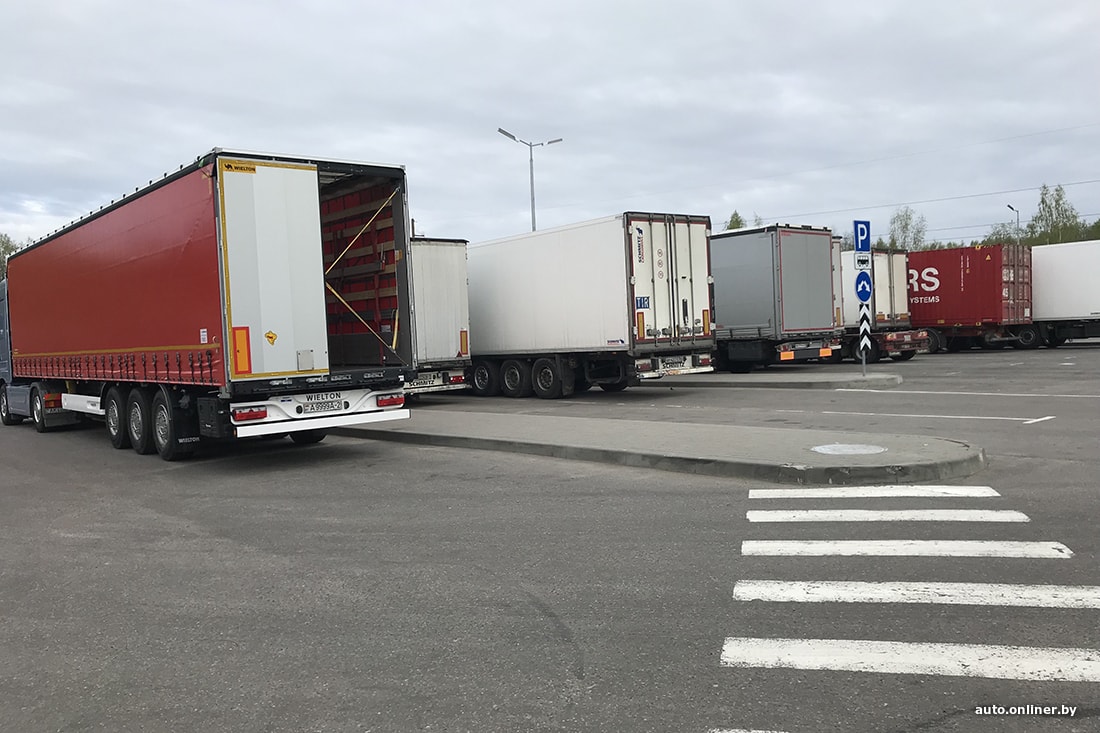 Это немаленькая станция с обширной подконтрольной территорией, размеченной для стоянки большегрузных автомобилей. В них, кстати, недостатка не было. Под линейку расположились фуры с белорусскими, российскими, литовскими и латвийскими номерами: сплошь Volvo, DAF, MAN, Mercedes — международники.