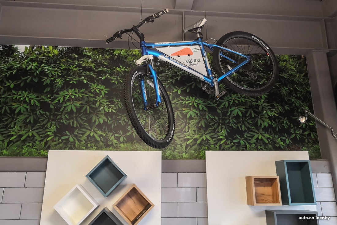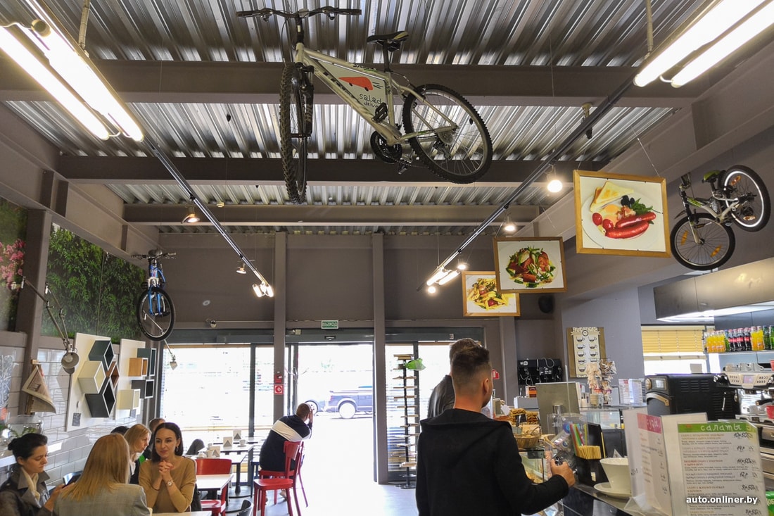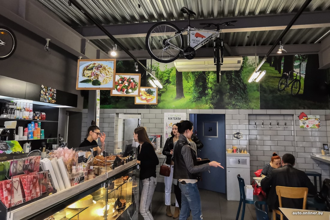 В этом самом кафе, оформленном в стиле велосипедных покатушек, действительно обширное меню: от пицц и салатов до яичницы и тортов на заказ со сладостями хенд-мейд. Посидеть можно на улице на лавочках, на террасе, внутри на диванах у столиков. На стенах — полки с книжками. Книги можно читать, полку — купить. Тут же — ящик с ячейками для зарядки гаджетов. К сожалению, работали не все кабели. На всей территории можно подключиться к Wi-Fi.