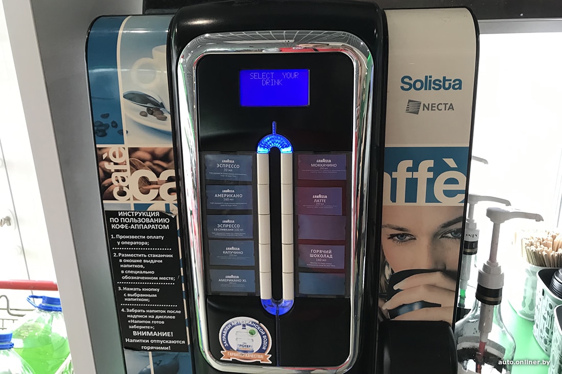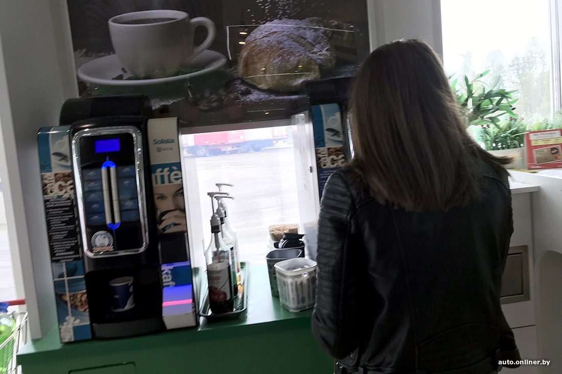 Для того чтобы получить горячий напиток, придется, к слову, отстоять очередь наравне со всеми, что не всегда удобно: кто-то платит за бензин, детвора развела папу на чипсы, а кому-то всего-навсего нужен стакан американо и немного отдохнуть в уголке. Но постоплаты на этой заправке нет: это касается в равной степени топлива и всех прочих товаров.