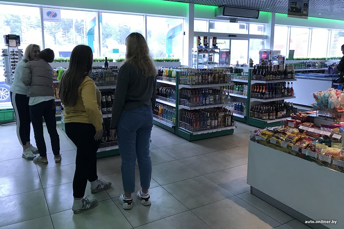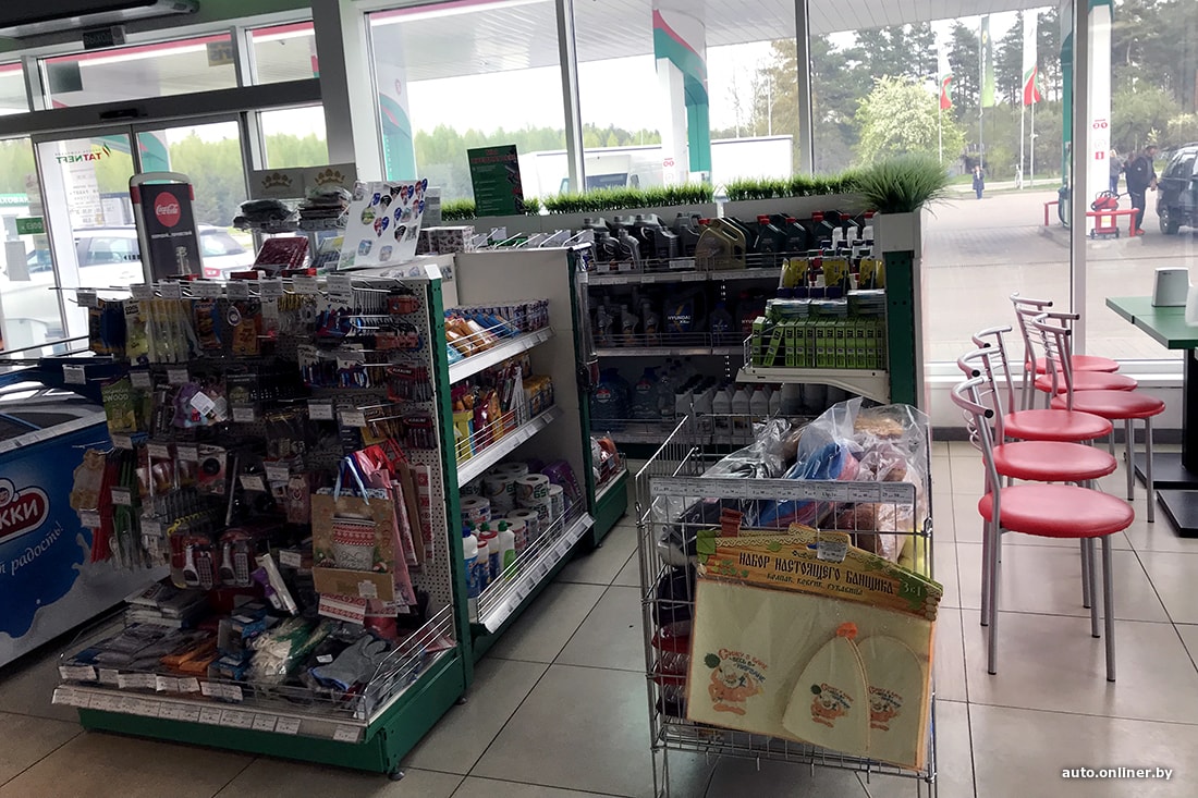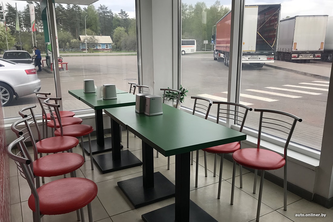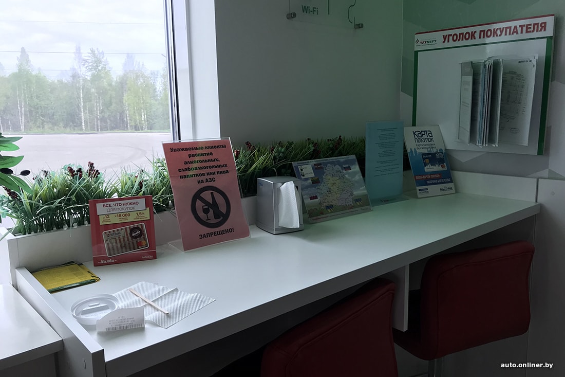 Скажем так, это АЗС улучшенного типа, где кроме прилавков со всякой всячиной есть столики, за которыми можно перекусить. Перекусить, но не выпить — ни водителям, ни кому-либо еще: о запрете предупреждает специальная табличка. Столики тем временем пустуют, хотя на станции, к примеру, есть доступ к Wi-Fi — можно скоротать время в интернете, попивая свой кофе.