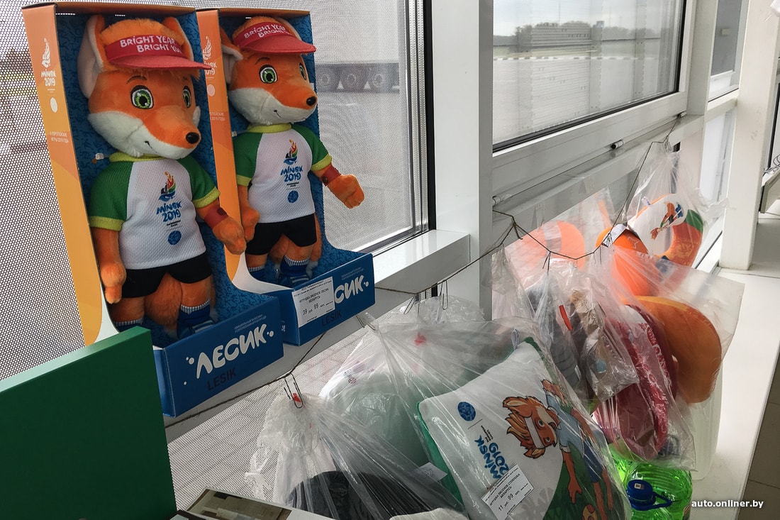 Тесновато. Между стеллажами остались только узкие проходы. Слева и справа уложены прохладительные напитки, печенье, мороженое, автомобильные принадлежности. Даже холодильники с пивом поначалу не бросаются в глаза. Увидели сувенирную продукцию Европейских игр в Минске. Лисы смотрели вокруг вполне доброжелательно.