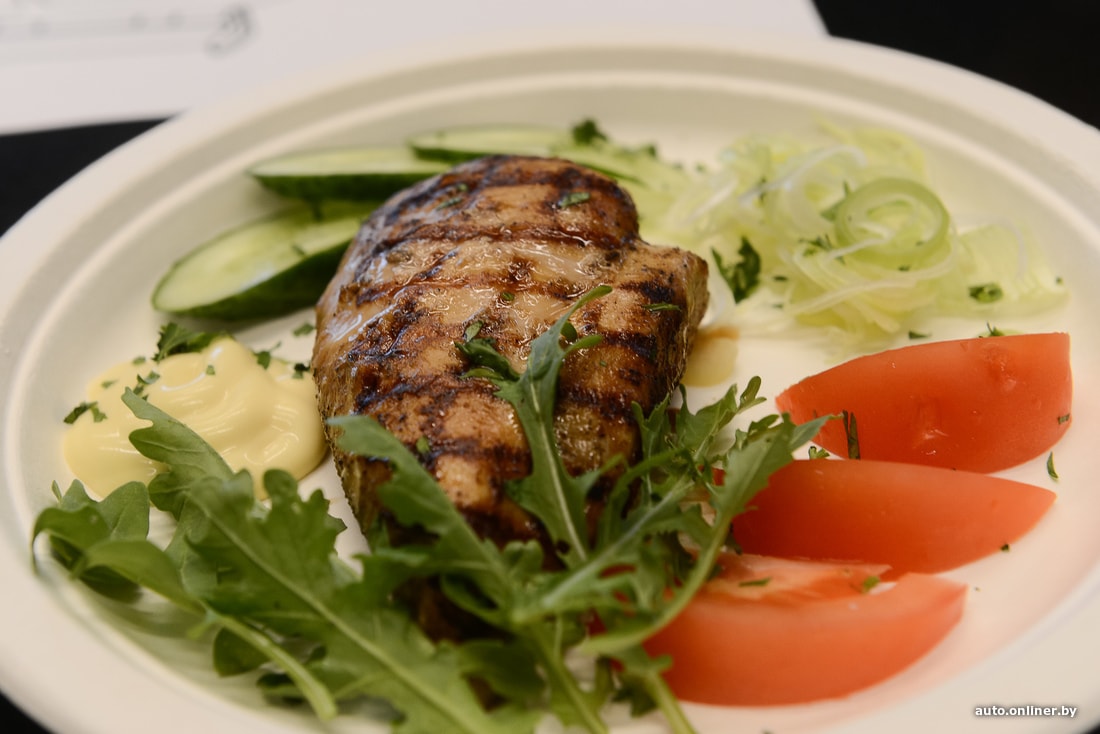 — Все как в кафе: рыба с листьями рукколы и долькой лимона. Она, видимо, была замаринована заранее, но претензий к ней нет — хорошая, плотная. Хотя без гарнира этим не наешься. Нужно брать первое, второе и компот, — отметил Алексей. — Посуда экологичная, тарелки на какой-то бумажной основе. Вот только пластиковые приборы портят впечатление. Вряд ли здесь такой контингент, который станет уносить ложки-вилки, да и вымыть их в посудомойке — не проблема.