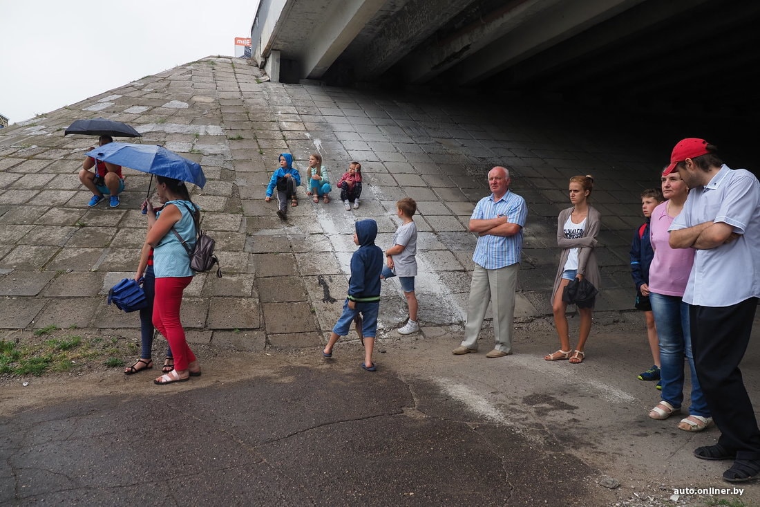 17:40. Весь день была жара, а перед самым часом пик погода ухудшилась. Сейчас на путепроводе развязки Независимости — Стариновская сильный ветер. Но люди стоят и ждут начала действа, передает корреспондент Onliner.