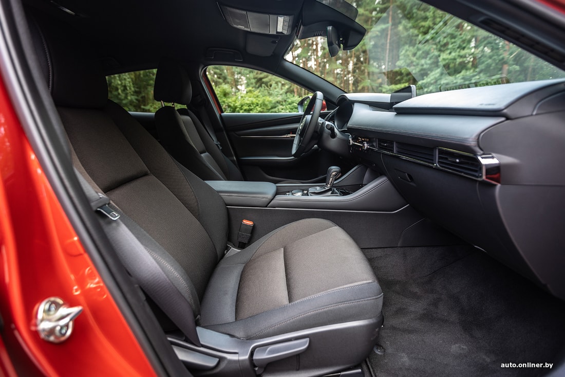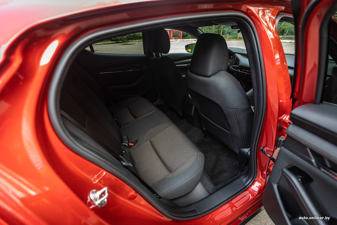 Еще Mazda3 — один из самых непрактичных автомобилей в своем классе. Нет, спереди все хорошо: хватает и места над головой, и ногам дышится свободно. Но все, что находится позади центральной стойки, отпугнет любого семьянина, который выбирает машину на все случаи жизни. Из-за характерного дизайна задней части проникать на второй ряд высоким людям довольно затруднительно. Кроме того, там маловато места как для ног, так и для головы. Если за рулем находится человек ростом выше 185 сантиметров, за ним с комфортом поместится разве что ребенок.