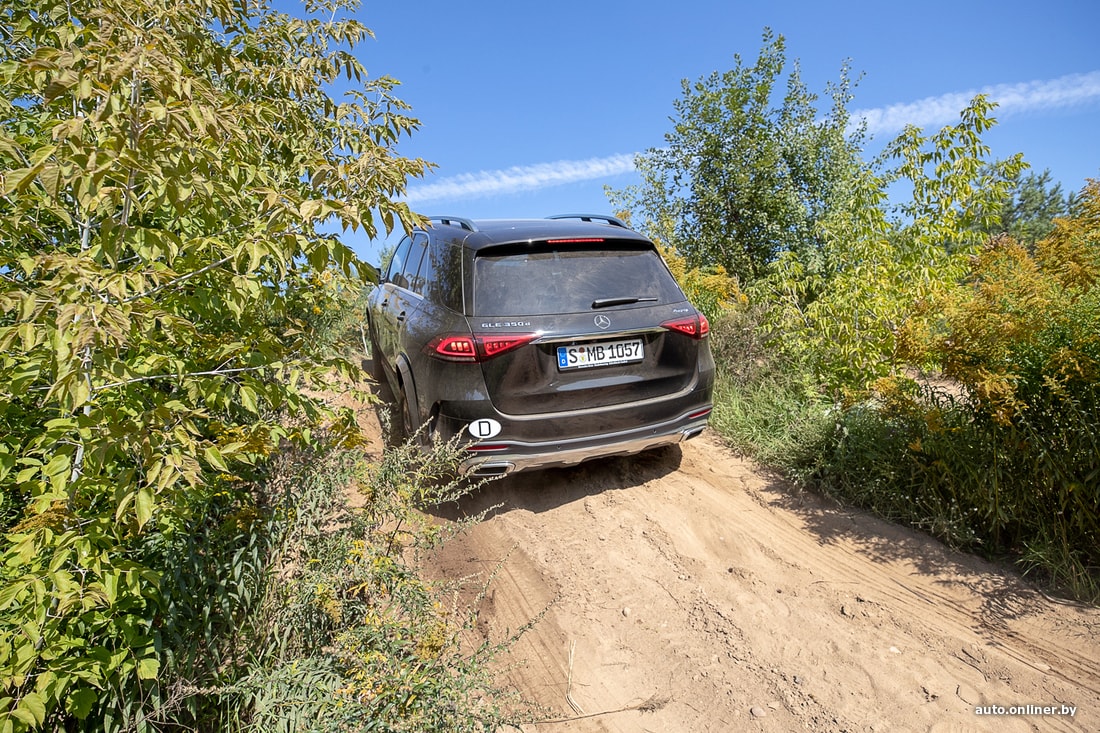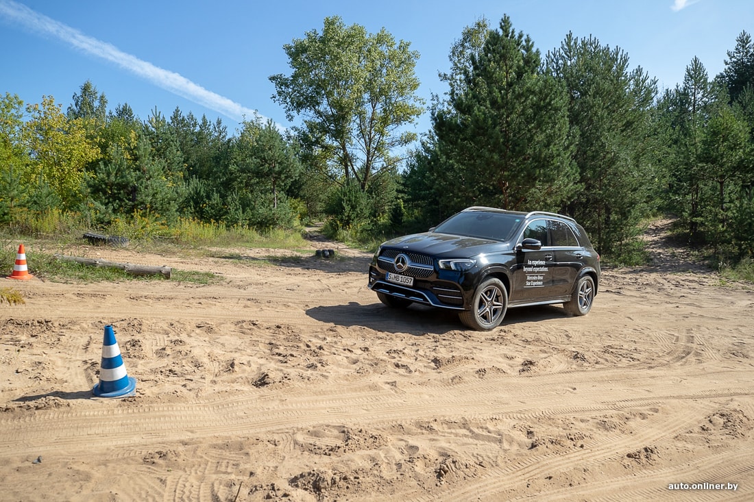 Для начала отправляемся на Off-road. Колонна, состоящая из G-Class, GLE, GLS и X-Class, послушно последовала за дилерским GLC. Дорога до условного бездорожья недолгая — пару минут от полигона. Не все успели даже кресло под себя подстроить. Заезд на горку. Крутой спуск. Немножко песка, и все по новой. На заграничных журналистских тест-драйвах такое бездорожье вызвало бы улыбку, но здесь собрались в основном люди, не разбалованные такими поездками, поэтому все были рады.