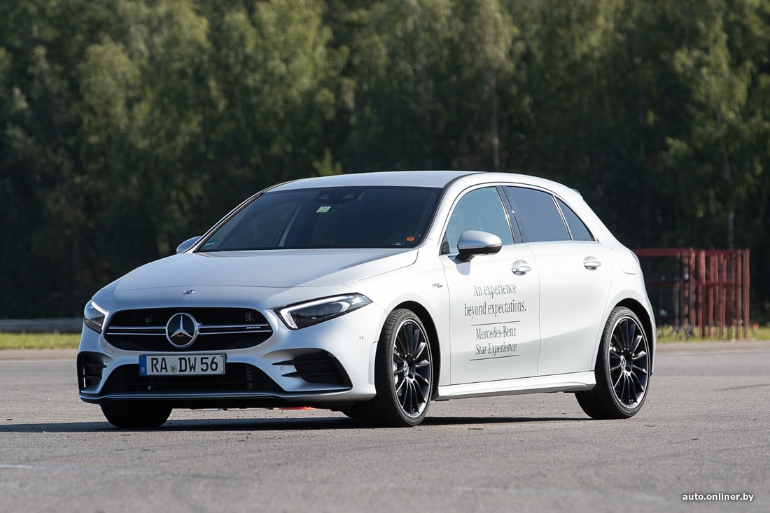 Сразу за инструкторским автомобилем, похрюкивая, несся AMG GT 63 S. Полноприводный 640-сильный седан является скорее родственником CLS, нежели удлиненным AMG GT. Фактически эта машина сменила на посту CLS63 и выступает в роли главного конкурента Porsche Panamera. Несмотря на свою громоздкость и внушительную мощь, GT 63 оказался покладистым «конем». Даже девушка с годовым опытом вождения обуздала этот спорткар и подгоняла инструктора словами «давайте прибавим скорость». Установленный под длиннющим капотом этого автомобиля 4-литровый V8 ставится буквально на весь модельный ряд Mercedes-AMG. Ну, кроме компактных «поперечных» моделей. На А35 и А45 (в Липках была только А35) установлен 2-литровый турбомотор, представляющий собой модульную половину V8 от AMG GT.