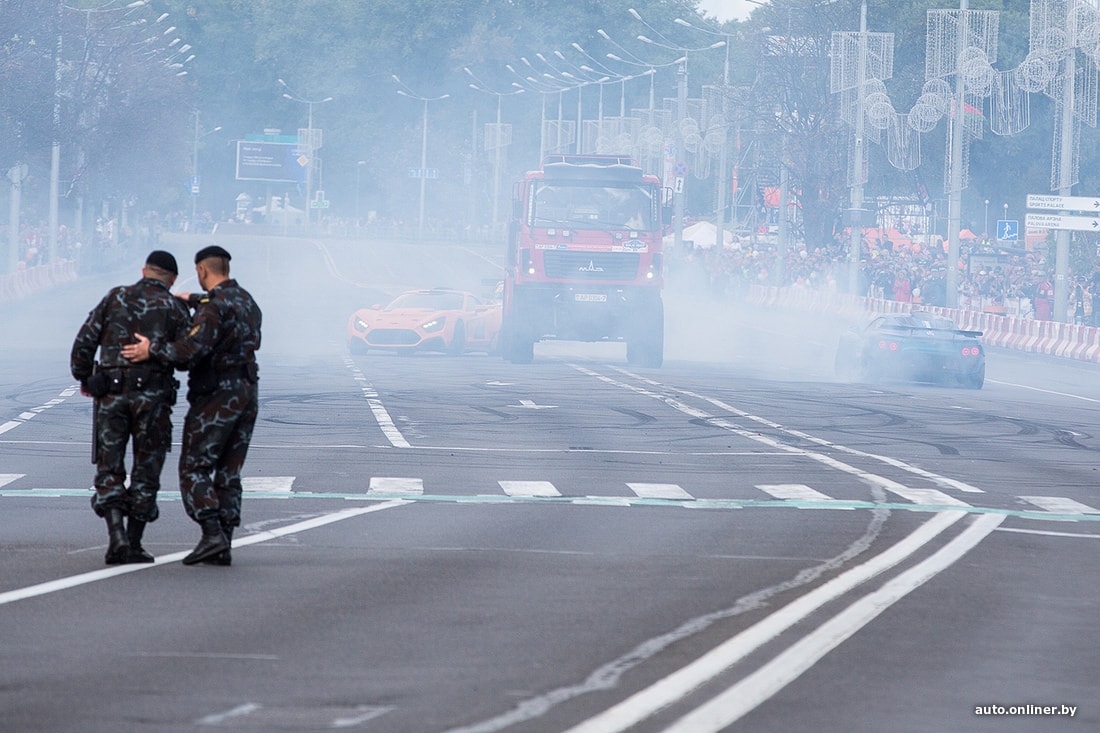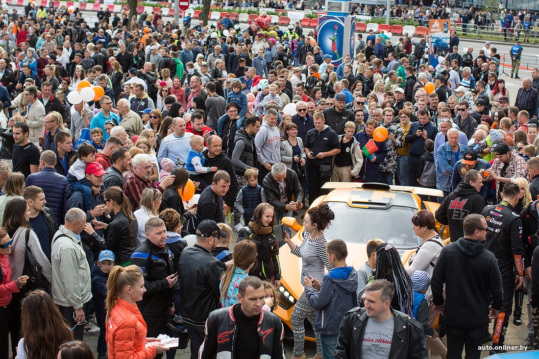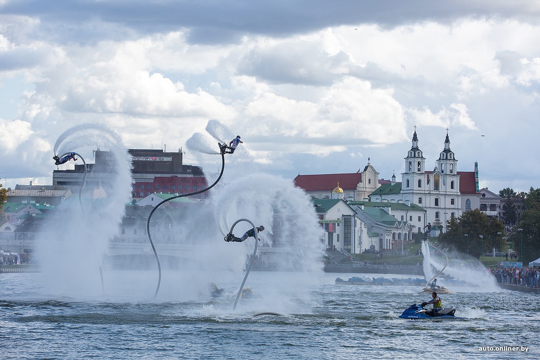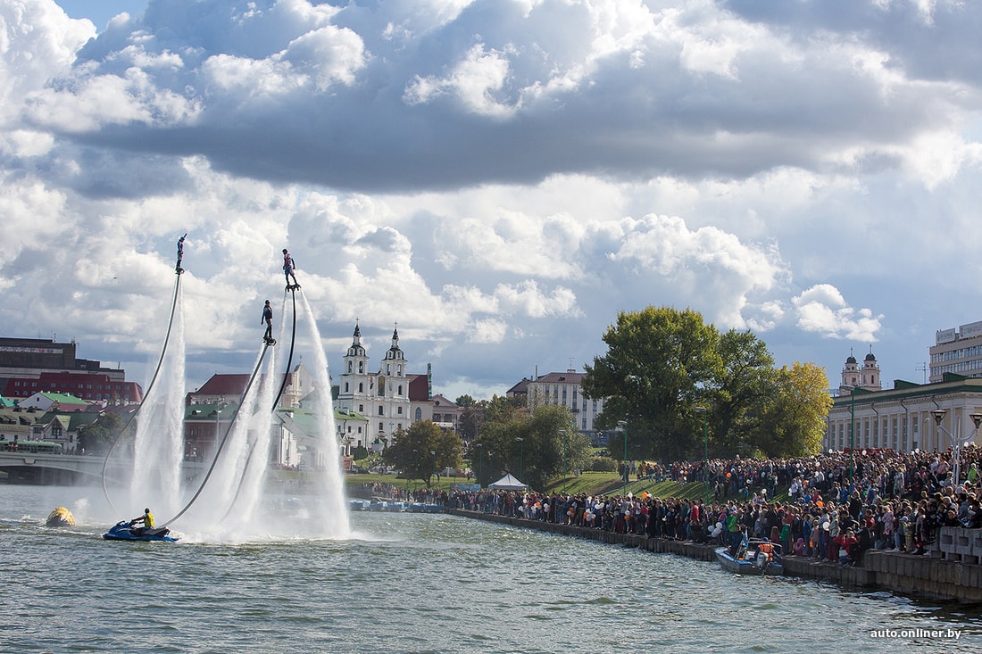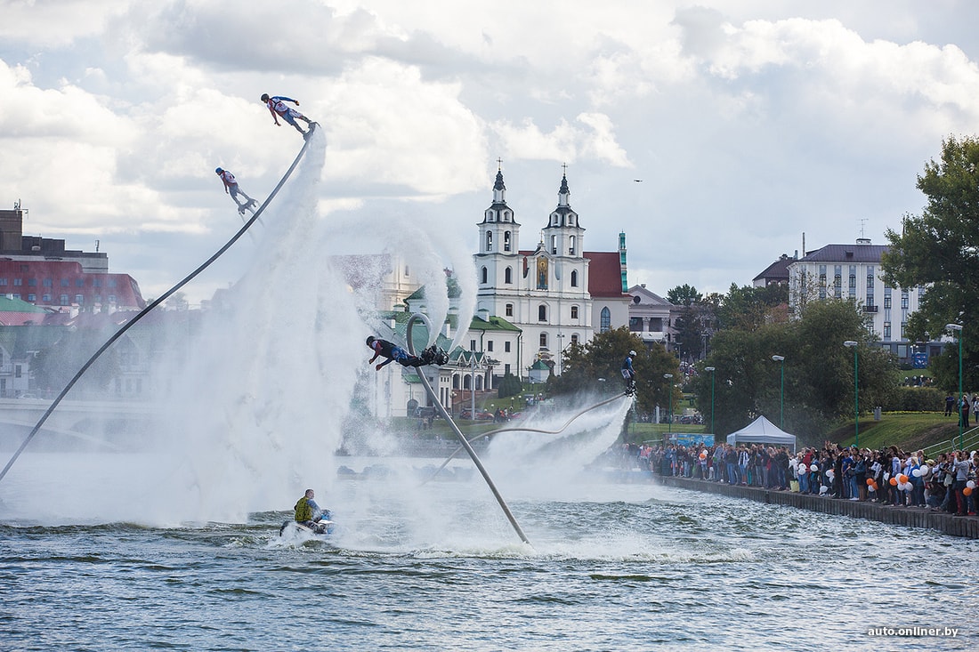 На площадке возле Дворца спорта сегодня было много музыки. Зрители увидели выступление дрифт-автомобилей и мотокаскадеров, чудеса техники показали спортсмены на Fly-board, полетавшие над Свислочью.