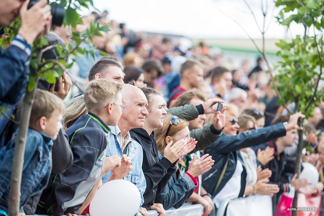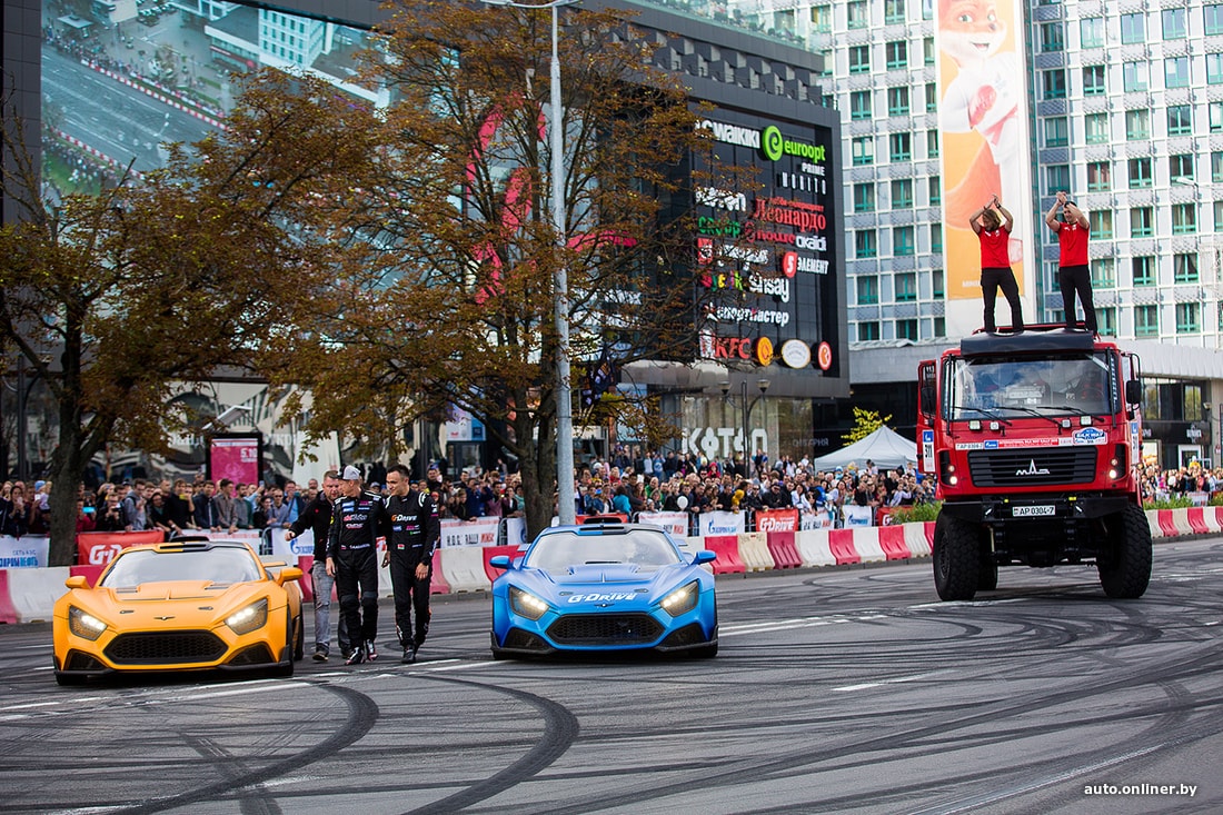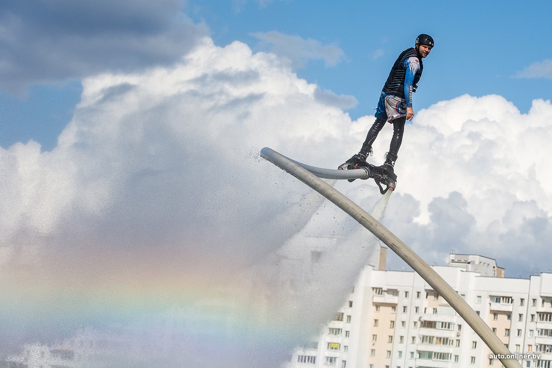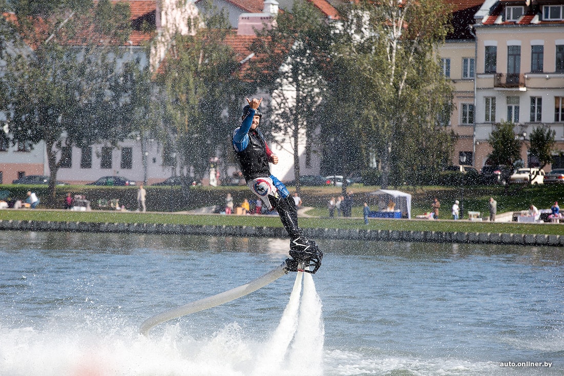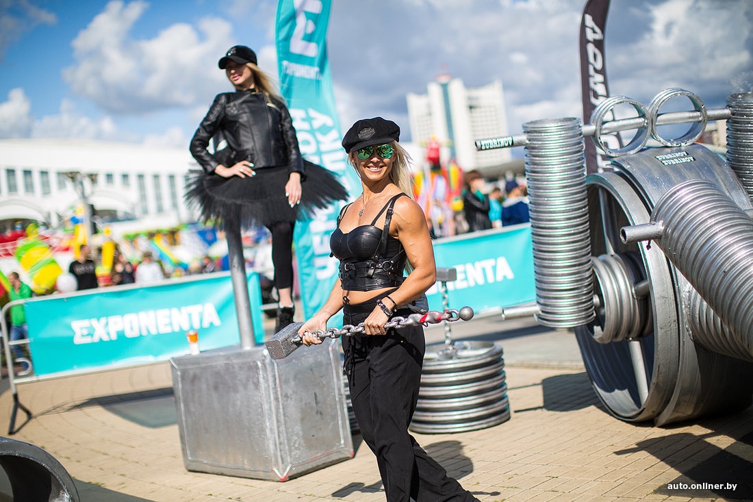 На площадке возле Дворца спорта сегодня было много музыки. Зрители увидели выступление дрифт-автомобилей и мотокаскадеров, чудеса техники показали спортсмены на Fly-board, полетавшие над Свислочью.
