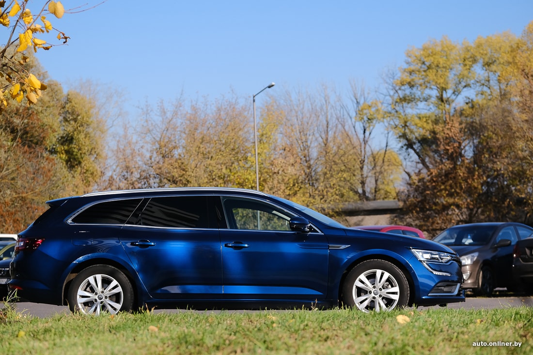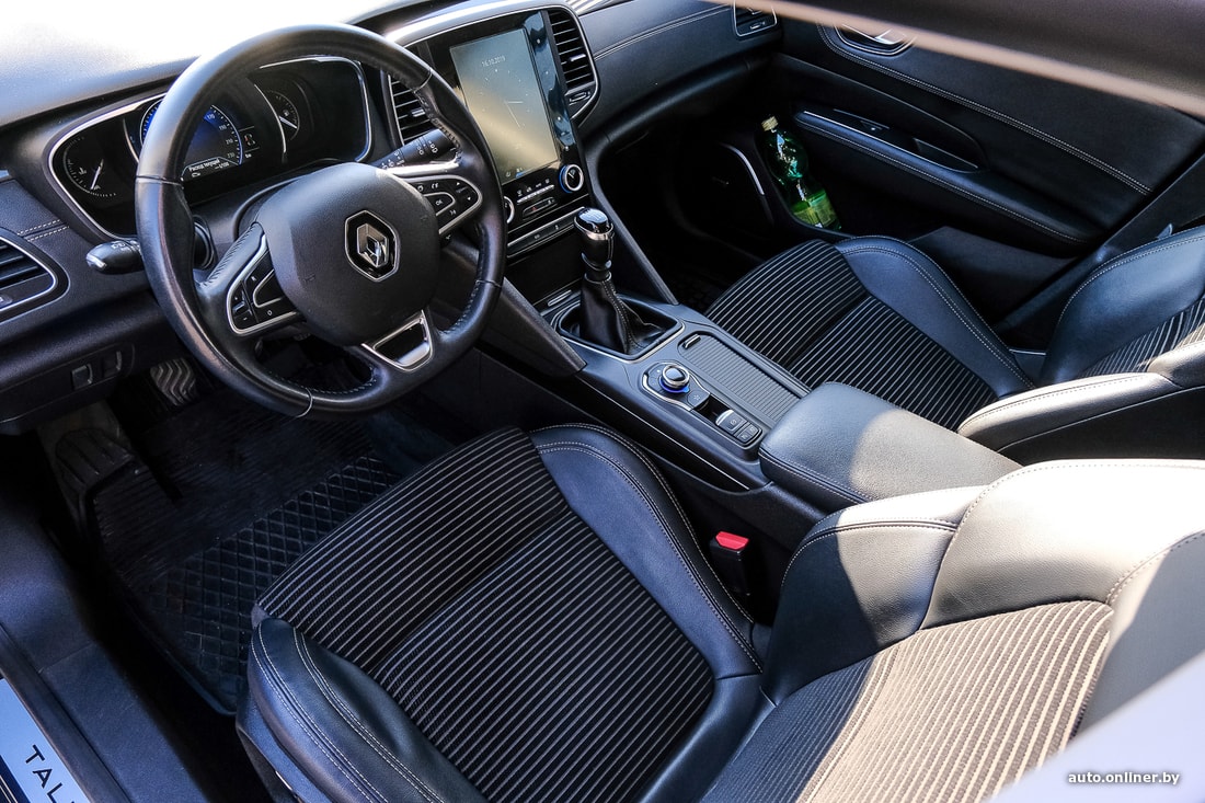В Беларуси проще встретить Bentley, чем Renault Talisman. Неудивительно, что универсал привлекает внимание на дорогах. Машина хоть и далеко не в самой дорогой комплектации (есть две более навороченные версии), однако укомплектована всем необходимым. Есть камера заднего вида, парктроники по кругу, комбинированный салон (кожа/ткань), мультимедийная система, 2-зонный климат-контроль, круиз-контроль, датчики дождя и света, полностью светодиодная оптика. Расход топлива — 5 литров на сотню. Бак при этом небольшой — 52 литра.