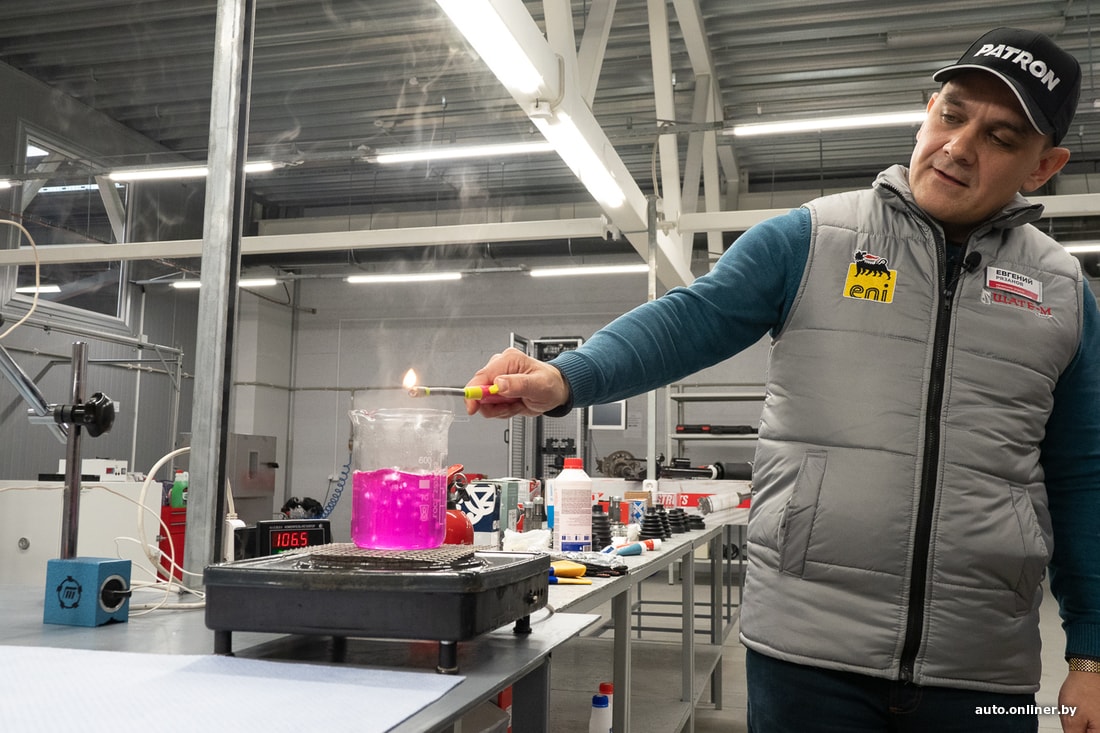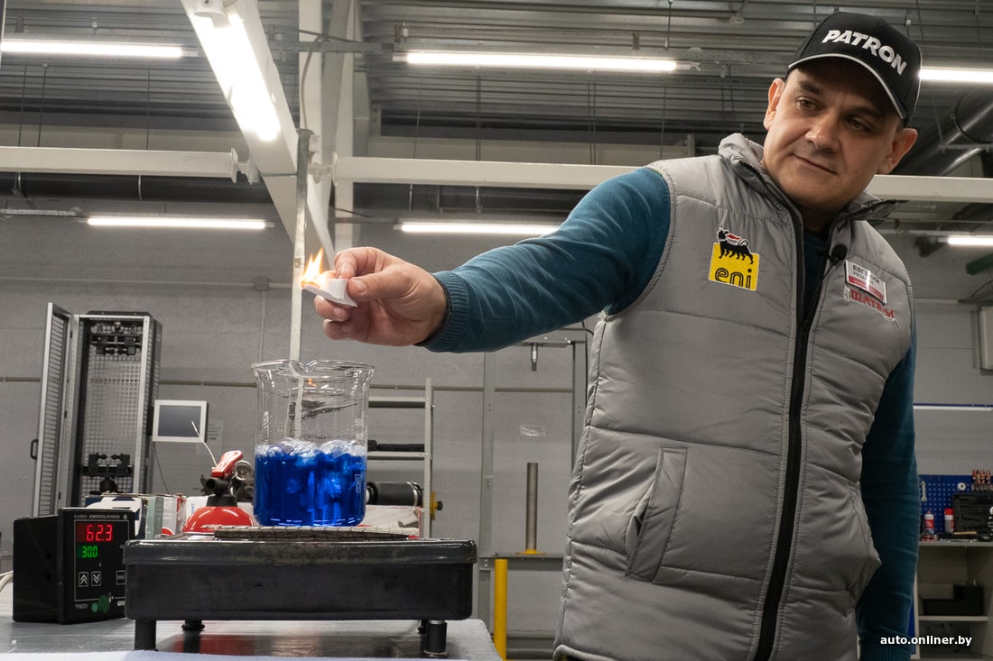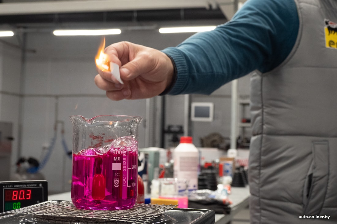 Расследование по антифризам приближается к кульминации. На данный момент завершена первая часть исследований. Эксперты обнаружили три образца, в которых содержится метанол. Это напрямую запрещено техническим регламентом Таможенного союза, и по идее такие канистры вообще не должны попадать в торговую сеть. Чем плохо наличие этого спирта в антифризе? Лучше продемонстрируем наглядно, во время небольшого теста. Подогреем подозрительные жидкости, проверим температуру кипения, а потом попробуем поджечь пары. Горит!