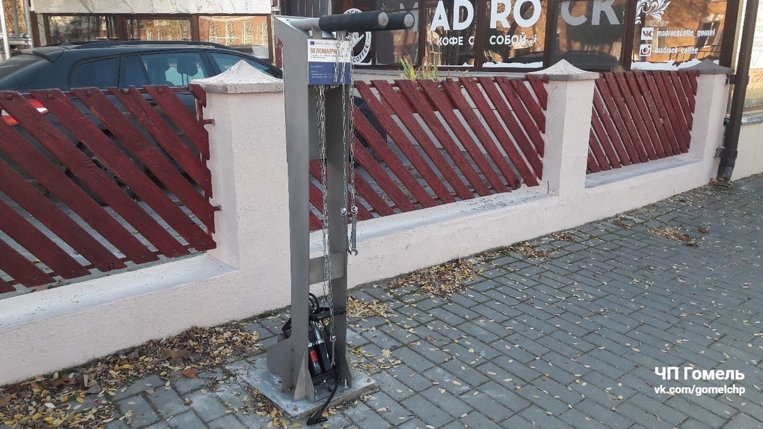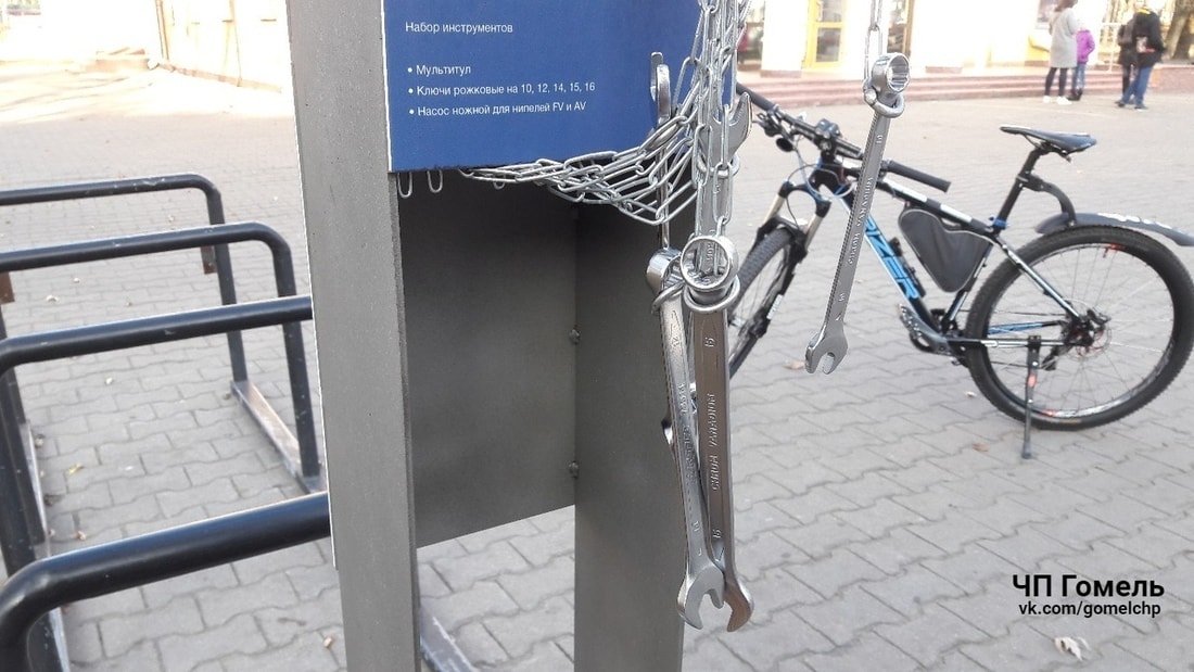 «Маячок» — это станция с инструментами для самостоятельного обслуживания и ремонта велосипеда. Они были установлены в разных районах Гомеля. Все под камерами. Инструменты закреплены специальной цепью.