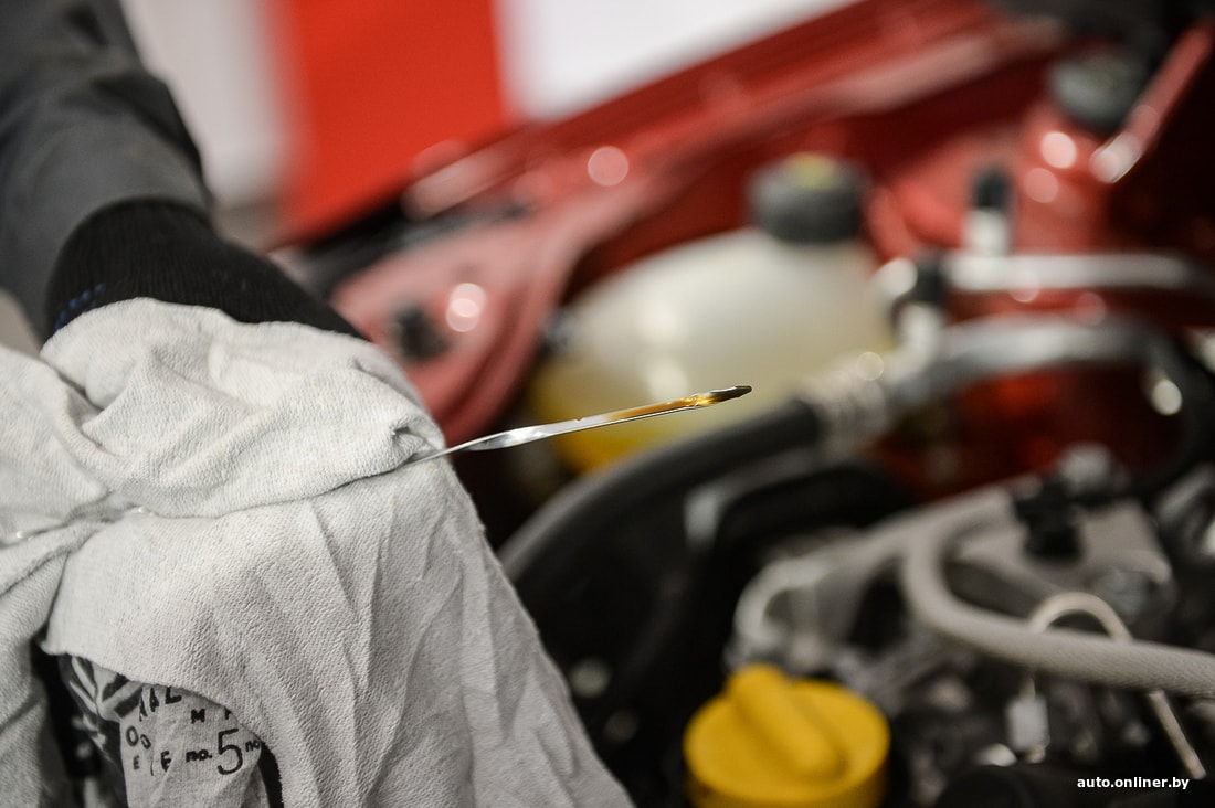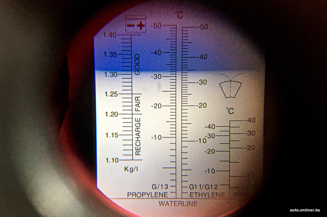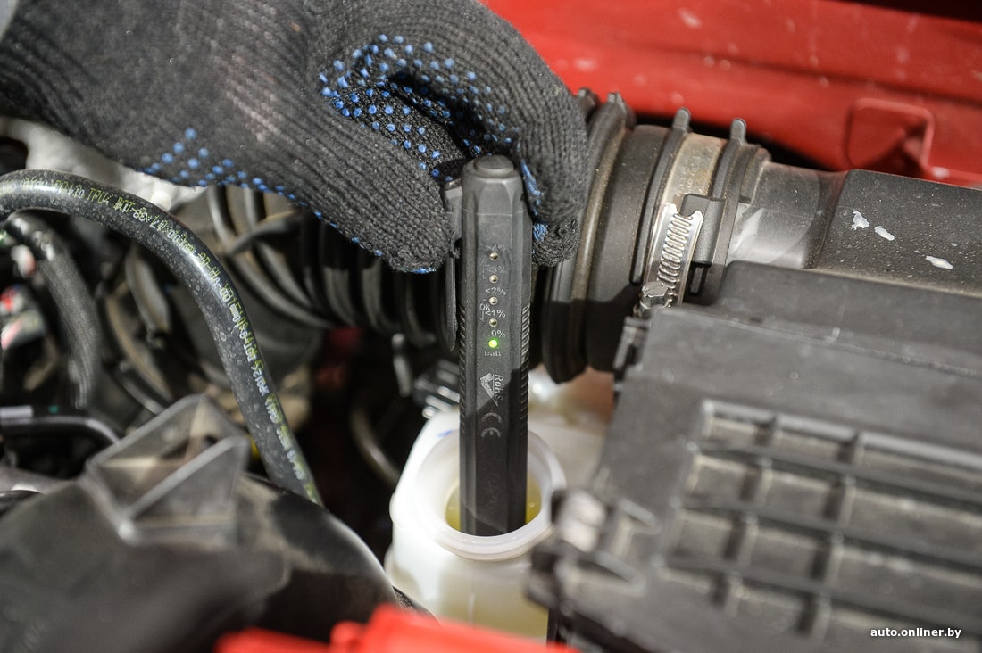 Уровень масла проверить можно и самому. Состояние жидкостей на сервисе измеряют с помощью рефрактометра — прибора, определяющего показатель преломления света в среде. Актуальные показатели для нашей Arkana в норме. Безусловно, летний стеклоомыватель стоит слить — просто зажать рычажок. За пару минут бачок становится пустым. В противном случае, если омывайка замерзнет, придется искать обогреваемый паркинг и ждать, пока она растает.