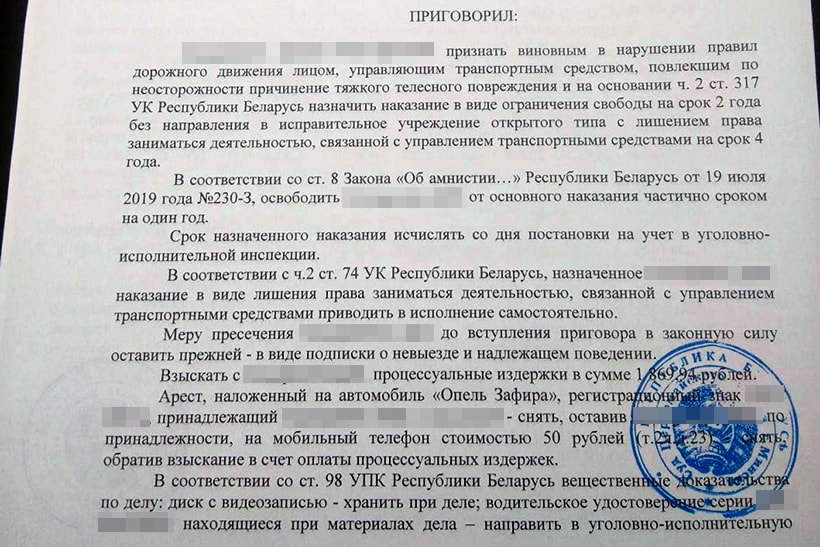 Через 40 минут обвиняемого позвали обратно, суд зачитал приговор: ограничение свободы на 2 года без направления в исправительное учреждение открытого типа, с лишением права заниматься деятельностью, связанной с управлением транспортными средствами, на 4 года.
