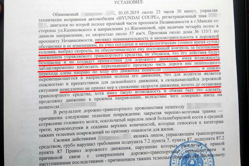 В результате следствие пришло к выводу, что опасность для движения водителю Hyundai возникла за 2,75 секунды до момента наезда на пешехода. В момент возникновения опасности автомобиль находился на расстоянии 43,54 метра от места наезда. Эксперт заключил, что с момента возникновения опасности для движения водитель располагал технической возможностью предотвратить наезд на пешехода путем применения мер экстренного торможения в условиях места происшествия.