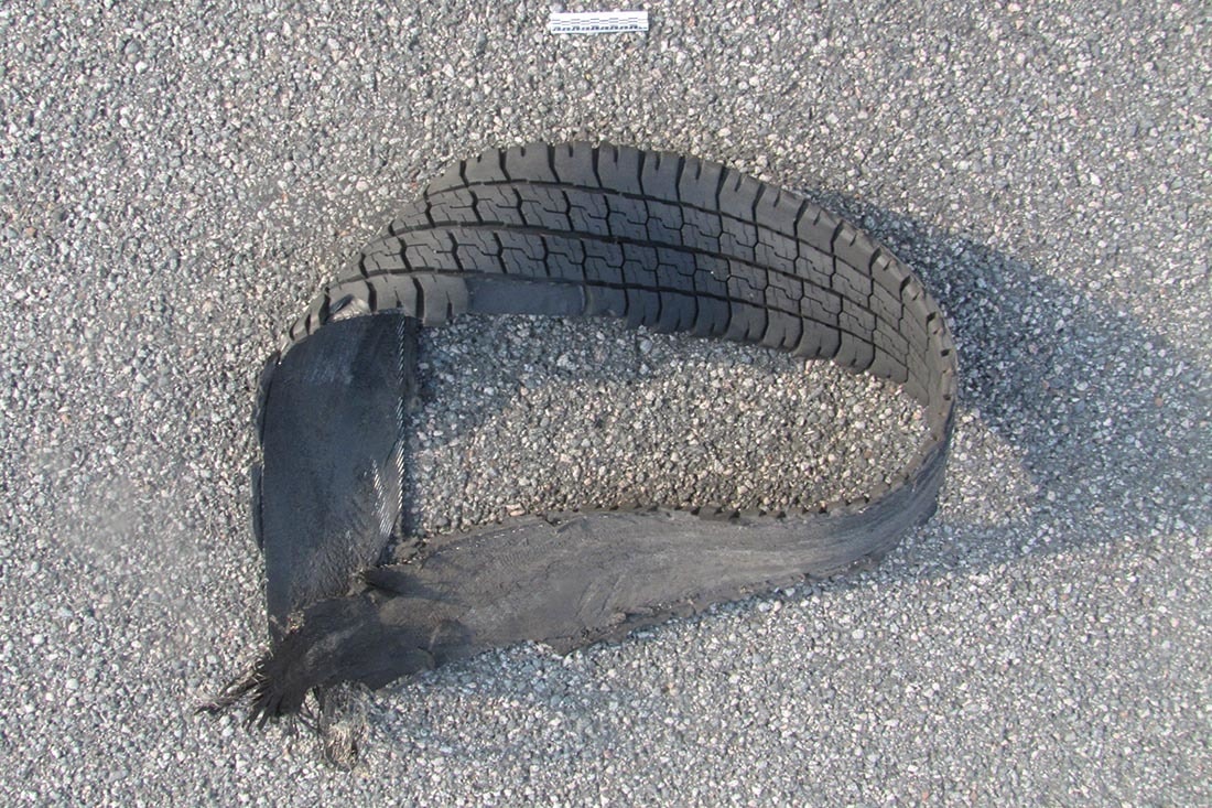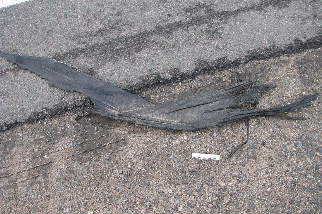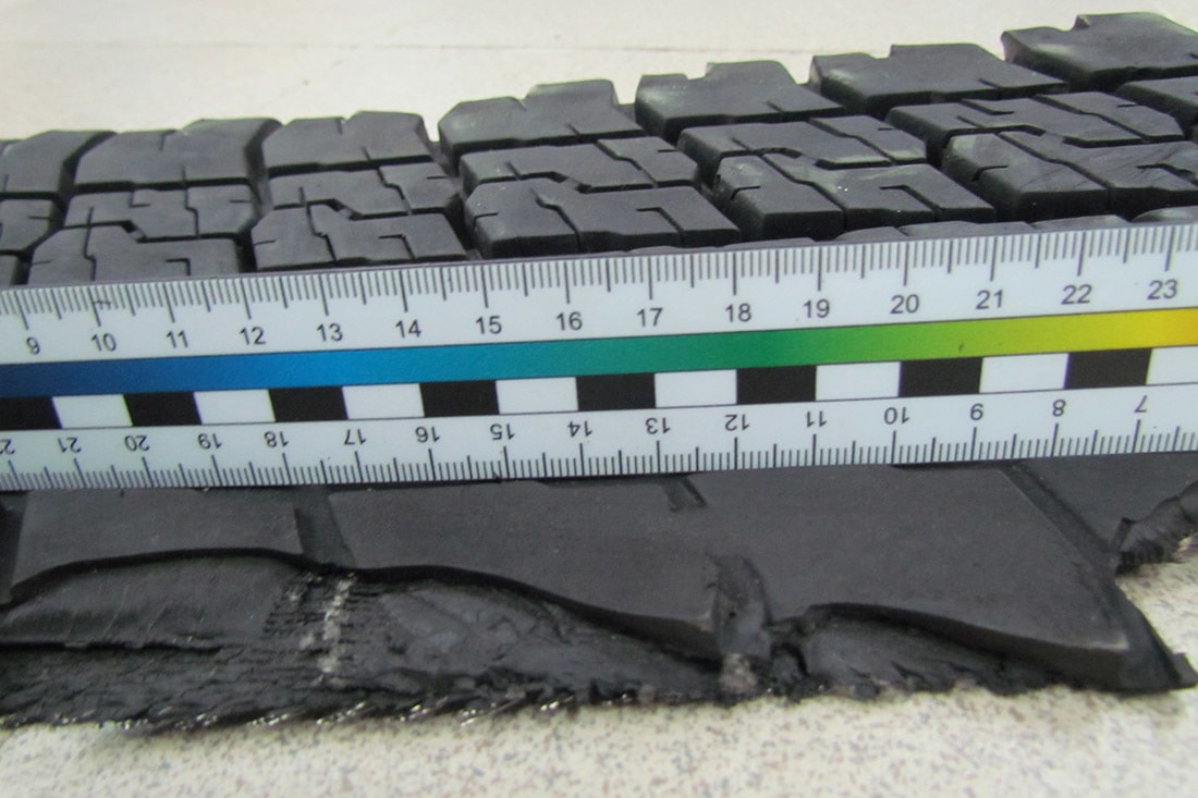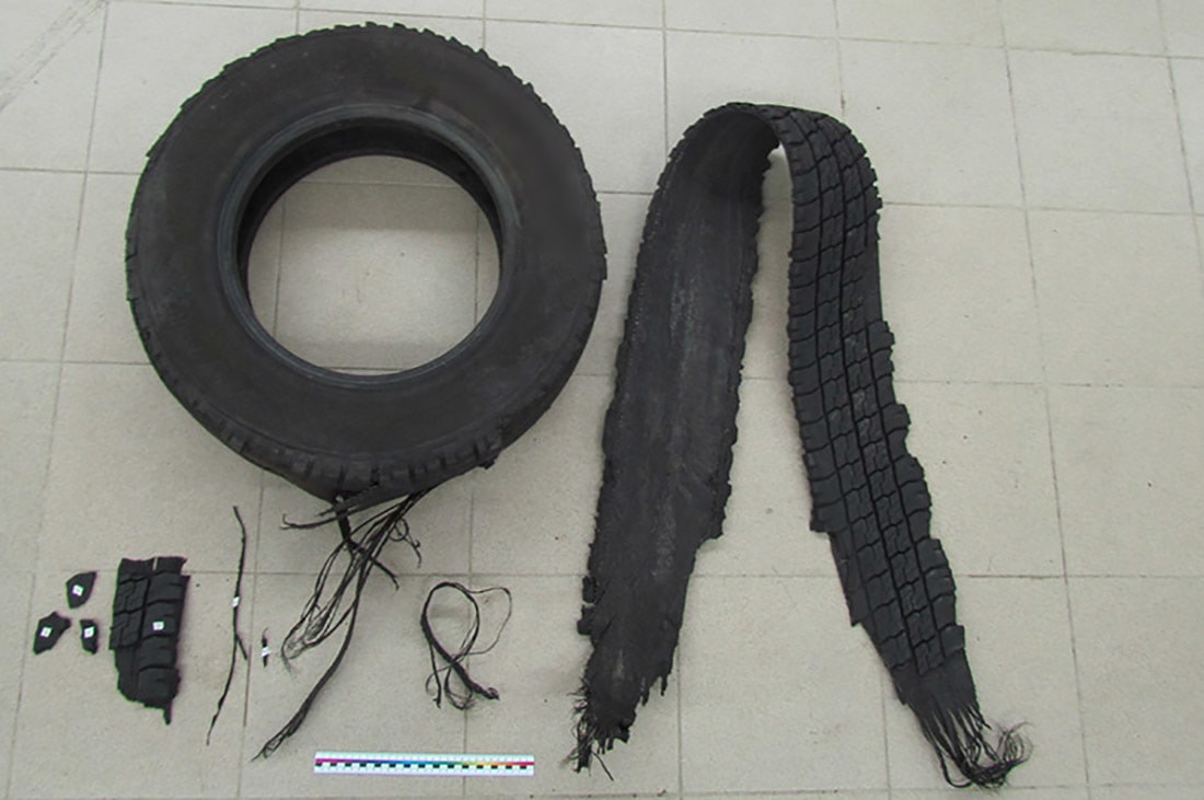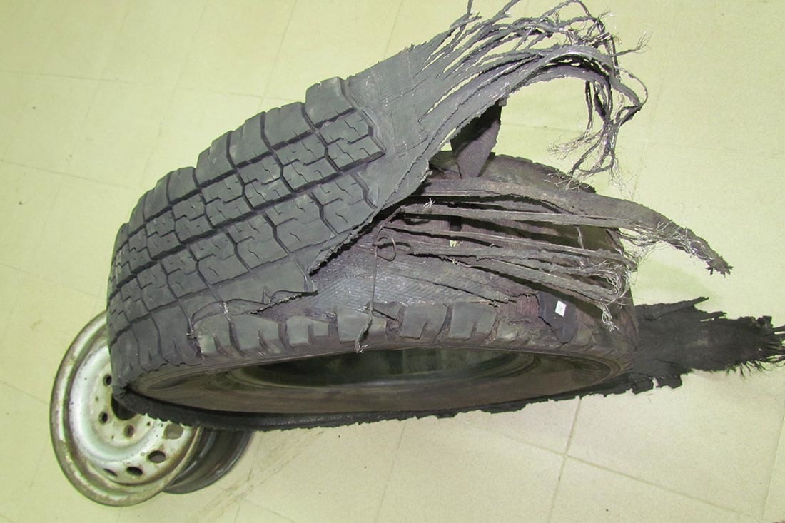 «На месте аварии нашли фрагмент протектора, который отслоился однозначно до момента удара — он лежал на другой стороне дороги, — вспоминает эксперт. — На исследование была предоставлена шина и фрагмент ее протектора. Однозначный вывод — произошел пневмовзрыв, отчего протектор отделился, машина ушла в занос и опрокинулась. Мы сложили остатки фрагментов шины, но полностью она не собиралась, отсутствовал небольшой элемент. Его так и не нашли».