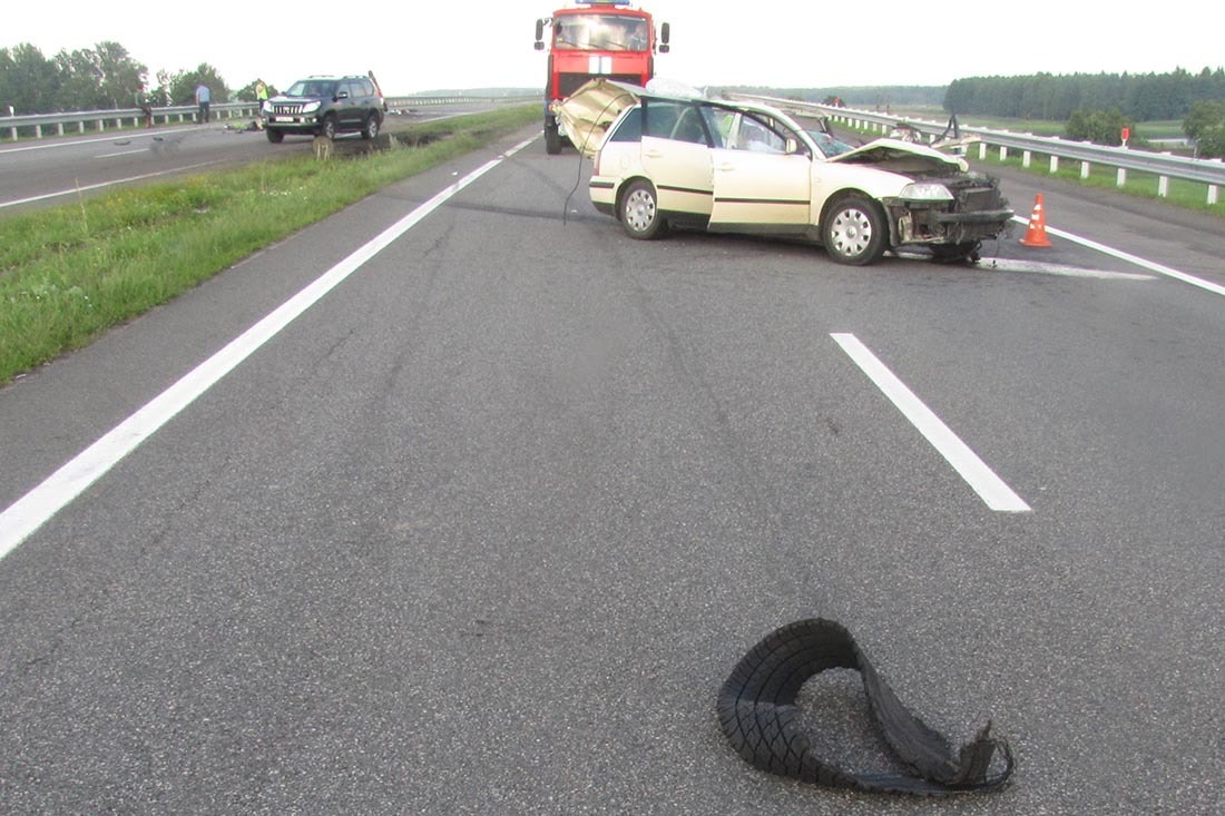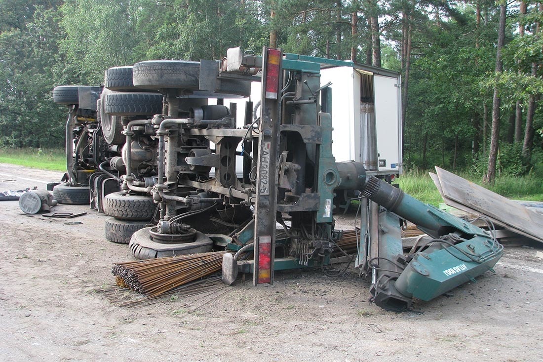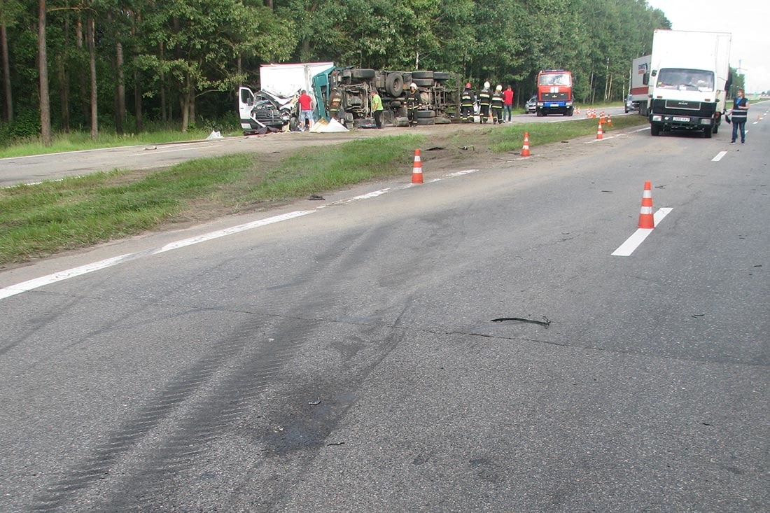 Износ протектора приводит к ДТП и в летнее время. Гомельская трасса: грузовик выезжает на встречную, падает на бок, в этот момент в лежащую кабину врезается фургон. Без жертв тогда не обошлось.