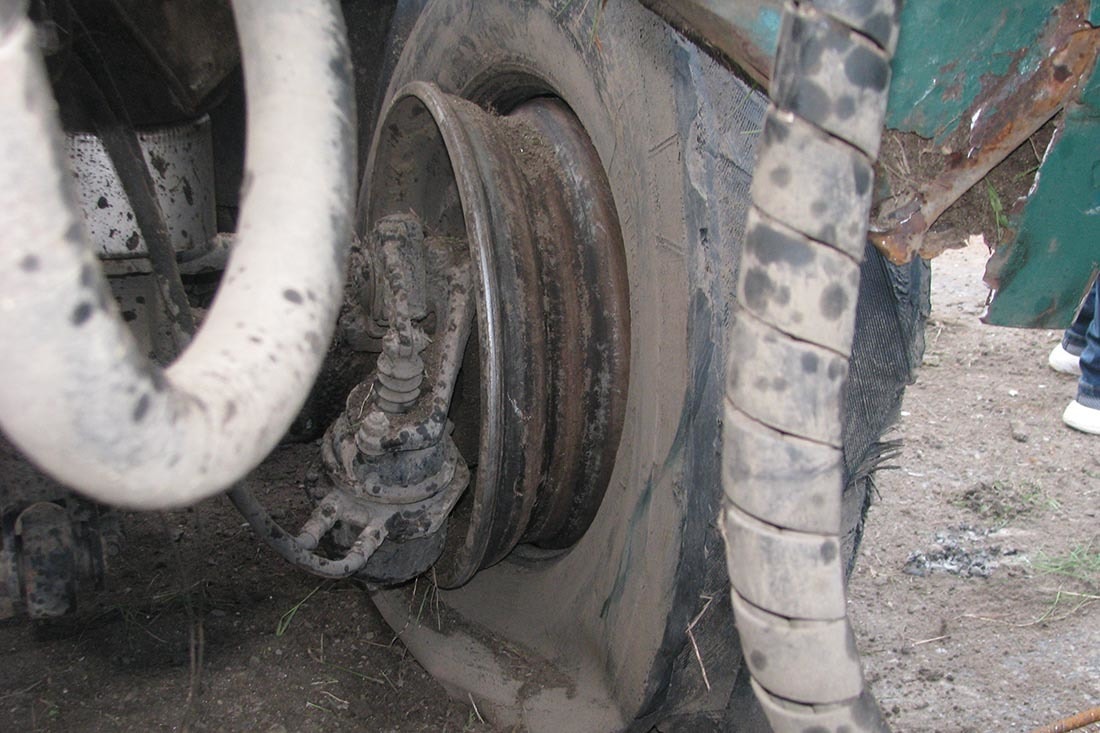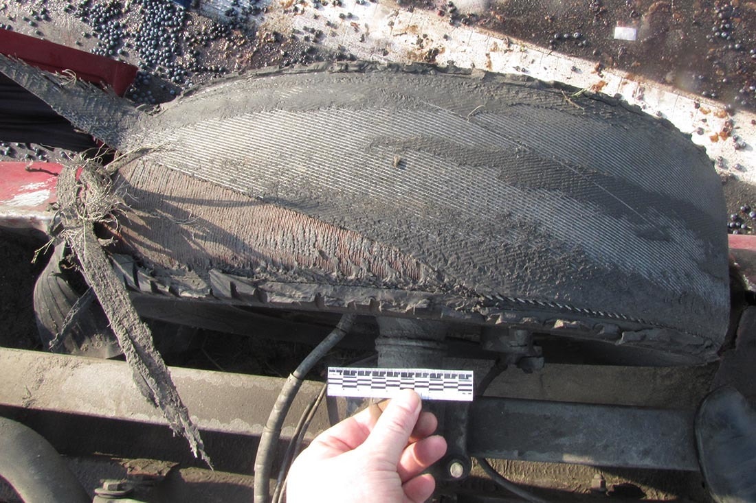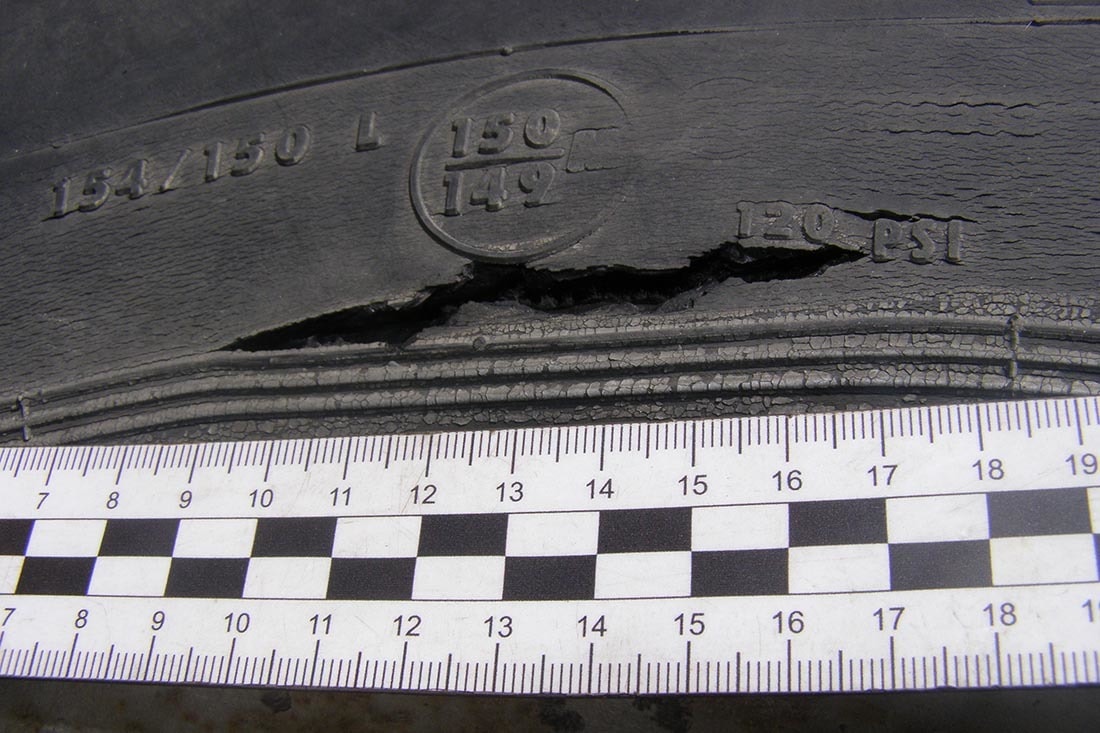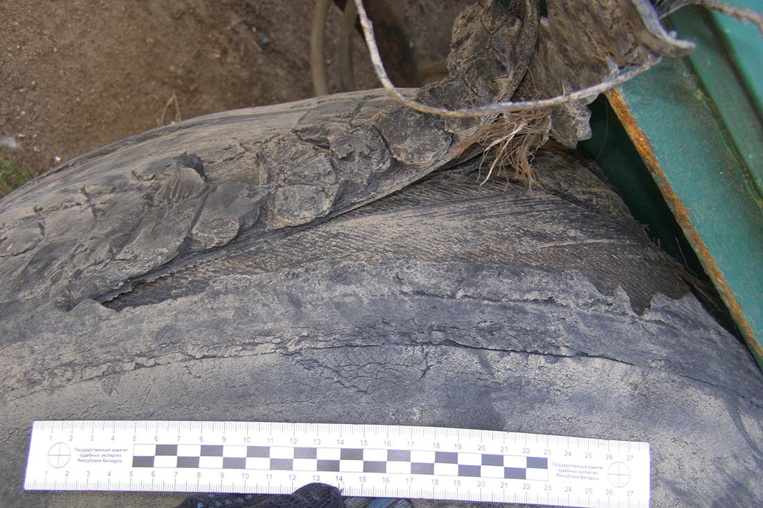 «Выехавшие на место происшествия эксперты сразу обнаружили на заднем левом колесе отсутствие верхнего слоя шины, — рассказывает Алексей Цыбульский. — На полосе, откуда выехал на встречную грузовик, остались отслоившиеся куски резины. Они лежали как раз у следов, свидетельствовавших о боковом скольжении. Протектор отслоившихся элементов свидетельствовал о серьезном износе. Позже, изучив маркировку шины, заметили цифру 9 — год выпуска. Но после 2000-го резину стали маркировать с использованием нуля (09). То есть можно предположить, что покрышка была выпущена в 1999 или 1989 году — ей на момент ДТП было минимум 20 лет. На других шинах были обнаружены сетки трещин. В приложении 4 к ПДД (перечень неисправностей, при которых запрещается участие в движении) указано: „шины имеют местные повреждения (пробои, порезы, разрывы), растрескивания от старения резины“».