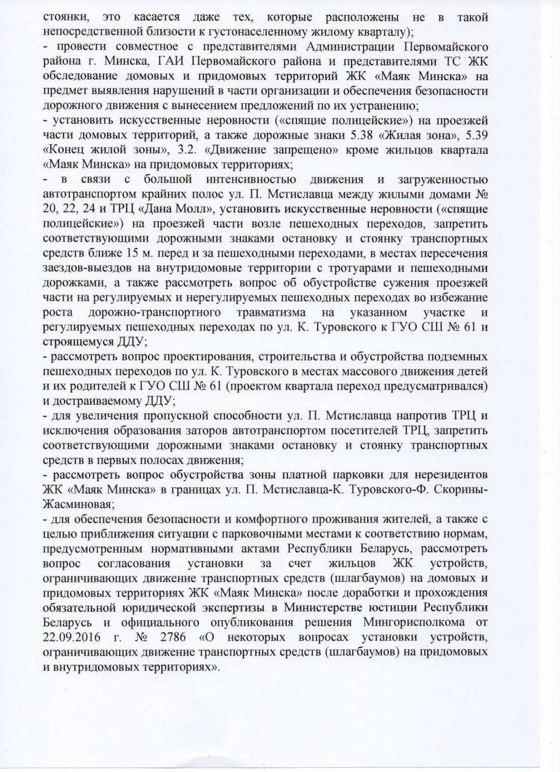 Жители «Маяка Минска» утверждают, что сложившаяся ситуация носит катастрофический характер, и требуют у городских властей рассмотреть с руководством ИООО «Зомекс Инвестмент» вопрос отмены платы за въезд и хранение личного автотранспорта на парковке ТРЦ Dana Mall для жителей жилого комплекса, что поможет разгрузить дворы. К тому же жильцы предлагают ужесточить контроль за соблюдением ПДД и правил парковки во дворах комплекса, обустроить рядом с «Маяком Минска» зоны платной парковки для его нерезидентов, а также разрешить жильцам огородить дворовую территорию шлагбаумом.