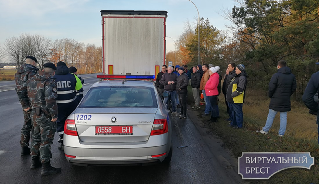 Сегодня утром в Бресте перевозчики частично блокировали проезд по Каменецкому кольцу в северной части города — через него проходит трасса M1 (ведет к пункту пропуска «Козловичи»), рядом расположено здание Транспортной инспекции области. Это была так называемая предупредительная акция: фуры задержались на кольце на 5 минут, не перекрыли трассу полностью, тем не менее движение тут же стало затрудненным, образовался затор. В акции приняло участие 5 фур и около 15 легковушек — просто чтобы показать, что можно устроить даже небольшим количеством транспорта. При этом водители не нарушали ПДД — просто ездили по кругу.