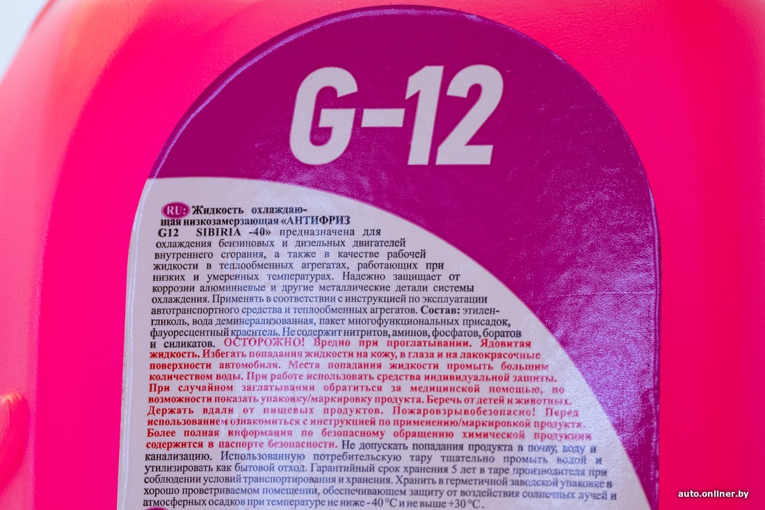 Охлаждающие жидкости под брендом Sibiria давно присутствуют на рынке Беларуси. Канистра выполнена из полупрозрачного пластика. Жидкость — характерного для антифриза цвета. На лицевой этикетке имеется маркировка «G-12» и обозначен температурный диапазон (от –40 до +120 °C).