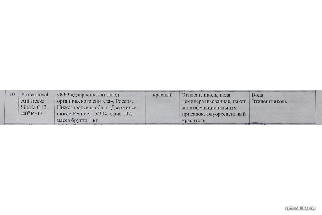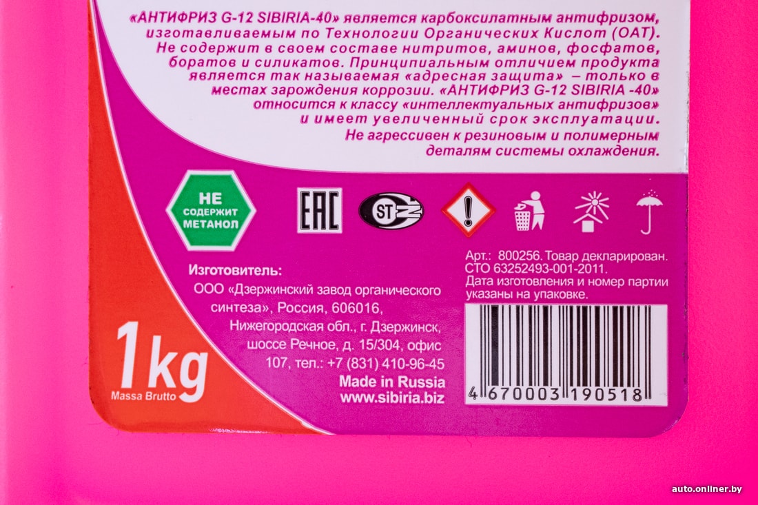 Три важных момента, о которых стоит сказать. Во-первых, указан вес, а не объем — 1 кг (причем брутто, т. е. вместе с упаковкой). Во-вторых, расписан состав. Он типичный для антифризов: этиленгликоль, вода деминерализованная, пакет многофункциональных присадок, флуоресцентный краситель. В-третьих, содержится информация о производителе — ООО «Дзержинский завод органического синтеза». Если загуглить название предприятия, то поисковик выведет на сайт, посвященный антифризам Sibiria.