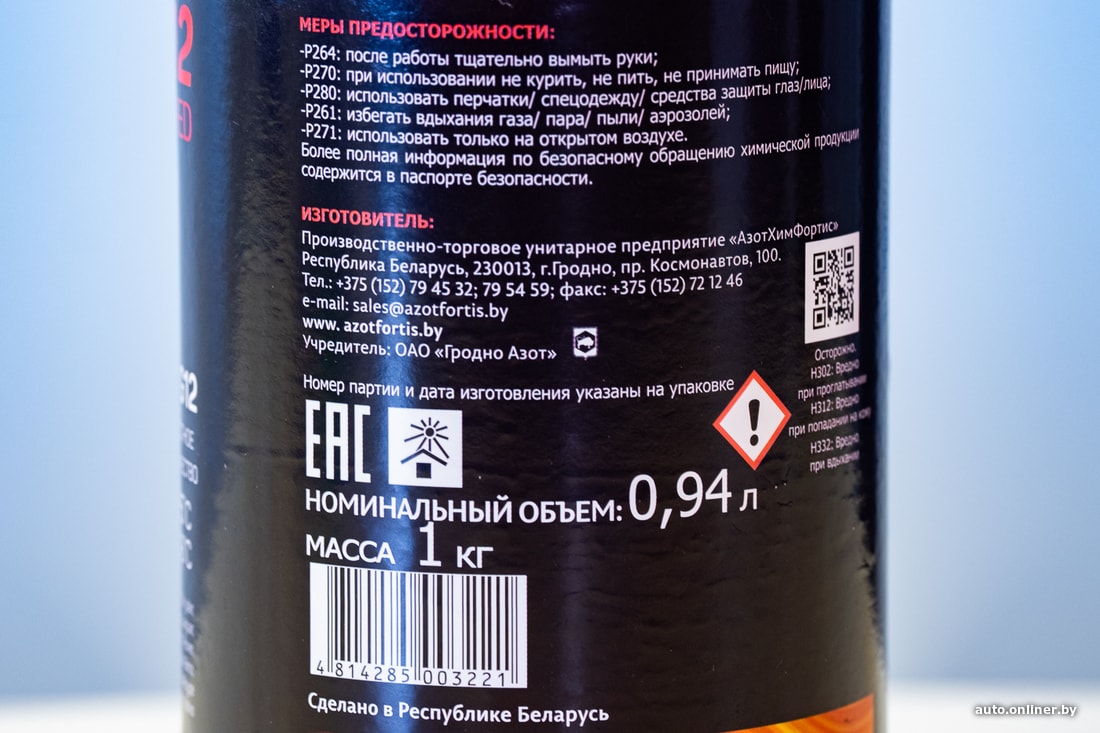 Переходим к отечественным производителям. Антифриз Fortis, несмотря на иностранное название, изготовлен в Гродно, а точнее, ПТУП «АзотХимФортис», дочерним предприятием ОАО «Гродно Азот». Канистра объемом 0,94 литра стоила на заправке «Белоруснефти» 4,97 рубля.