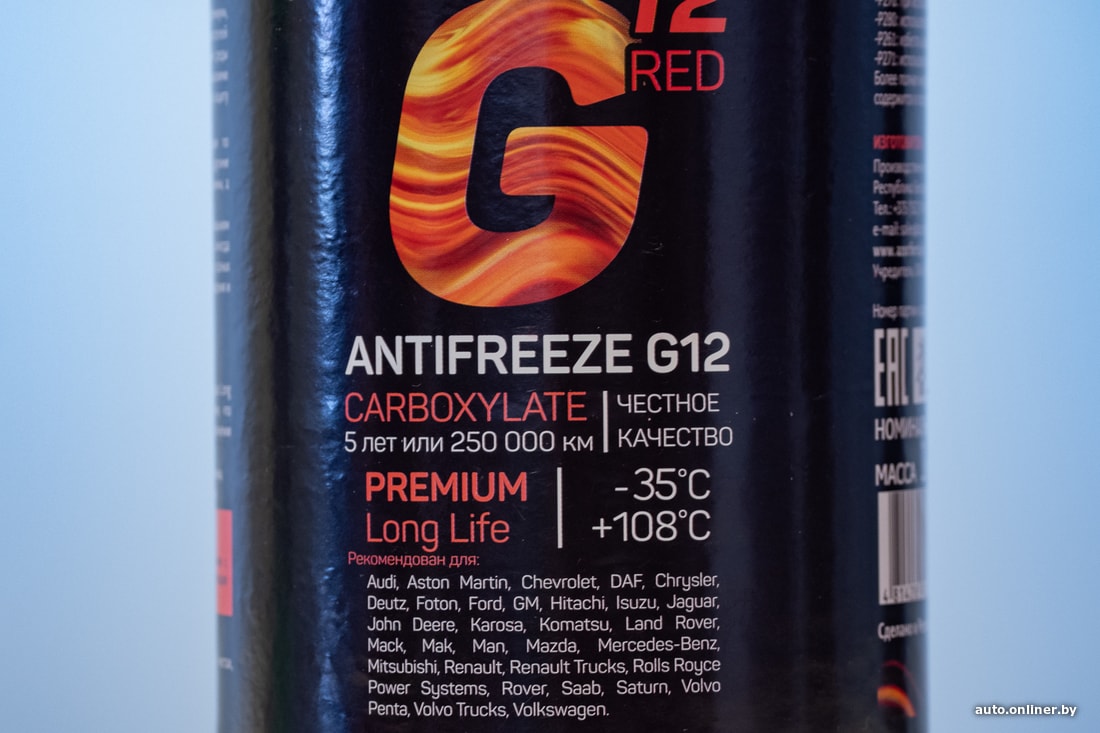 — Содержится довольно много данных, — рассматривает этикетку Евгений Рязанов. — Например, указаны и вес (1 кг), и номинальный объем (0,94 л). Утверждается, что содержатся карбоксилатные присадки с применением патентованной системы бельгийской компании Arteco (наравне с BASF — один из мировых лидеров в этой отрасли), а сам продукт относится к т. н. категории Long Life (250 тысяч километров или 5 лет). Температурный диапазон – от −35 до +108 °C. Очень громкая заявка!